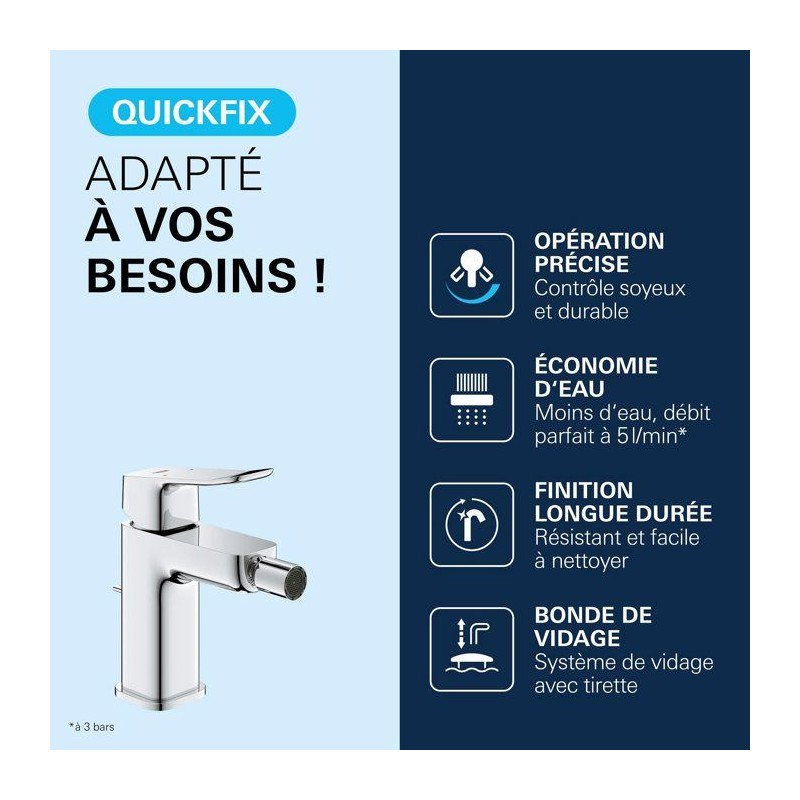 Découvrez le mitigeur de bidet GROHE DICE Chrome, un mitigeur de la gamme GROHE DICE conçu pour offrir confort d'utilisation, performance durable et design moderne. Pensé pour s'intégrer facilement dans toutes les salles de bain, ce modele de taille M associe une finition haut de gamme et un levier métallique précis pour une utilisation fluide au quotidien. Grâce a la technologie GROHE SilkMove, la cartouche en céramique garantit un contrôle souple et durable du débit et de la température. Le limiteur de débit et le limiteur de température vous permettent de réaliser des économies d'eau tout en profitant d'un jet parfaitement maîtrisé. Avec un débit maximal de 5 l/min a 3 bars, ce mitigeur allie efficacité hydraulique et confort d'utilisation. La rotule orientable et la tirette de vidage fournissent une maîtrise parfaite du jet et un usage quotidien facilité. L'installation est facilitée grâce au systeme GROHE FastFixation/QuickMount ainsi qu'a l'outil QuickTool inclus selon les versions. Les flexibles de raccordement souples et le corps lisse avec vidage clic-clac (selon modele) completent un ensemble pensé pour durer. La finition longue durée résiste parfaitement au calcaire, aux rayures et a l'usure du quotidien. Un choix élégant et fiable pour valoriser votre salle de bain.