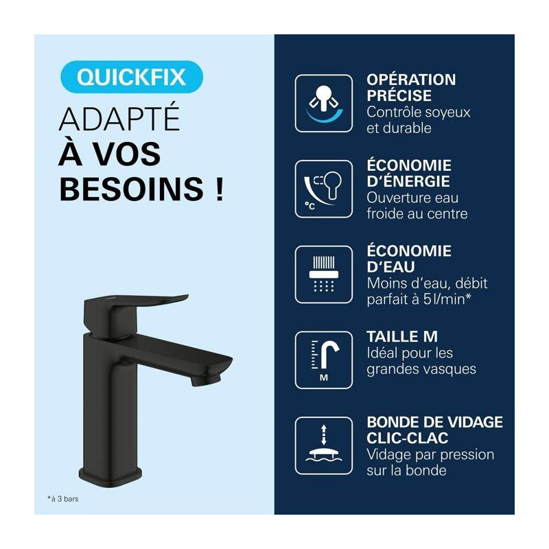 Découvrez le mitigeur de lavabo GROHE DICE Taille M cartouche Ch3 Noir mat, un mitigeur de la gamme GROHE DICE conçu pour offrir confort d'utilisation, performance durable et design moderne. Pensé pour s'intégrer facilement dans toutes les salles de bain, ce modele de taille M associe une finition haut de gamme et un levier métallique précis pour une utilisation fluide au quotidien. Grâce a la technologie GROHE SilkMove, la cartouche en céramique garantit un contrôle souple et durable du débit et de la température. Le limiteur de débit et le limiteur de température vous permettent de réaliser des économies d'eau tout en profitant d'un jet parfaitement maîtrisé. Avec un débit maximal de 5 l/min a 3 bars, ce mitigeur allie efficacité hydraulique et confort d'utilisation. Ce modele est équipé d'une cartouche SilkMove Économie d'énergie avec ouverture eau froide au centre, idéale pour réduire la consommation énergétique sans effort. L'installation est facilitée grâce au systeme GROHE FastFixation/QuickMount ainsi qu'a l'outil QuickTool inclus selon les versions. Les flexibles de raccordement souples et le corps lisse avec vidage clic-clac (selon modele) completent un ensemble pensé pour durer. La finition longue durée résiste parfaitement au calcaire, aux rayures et a l'usure du quotidien. Un choix élégant et fiable pour valoriser votre salle de bain.