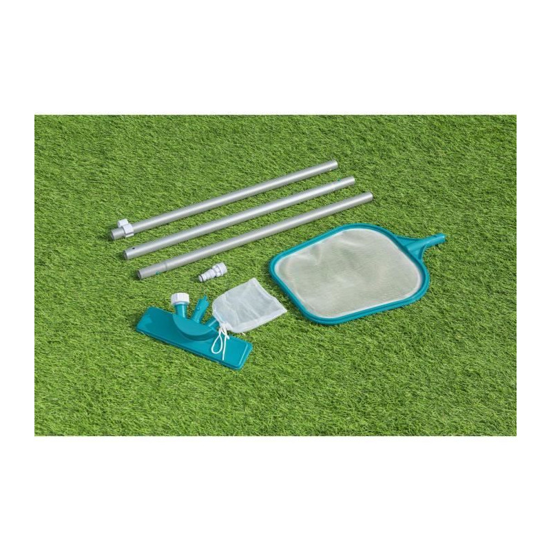 Ce kit de nettoyage manuel BESTWAY AquaClear(TM) comprend une épuisette et une tete d'aspirateur, idéal pour entretenir les piscines jusqu'a 3,96 m. Il permet de nettoyer efficacement le fond et les parois de tous types de revetements.