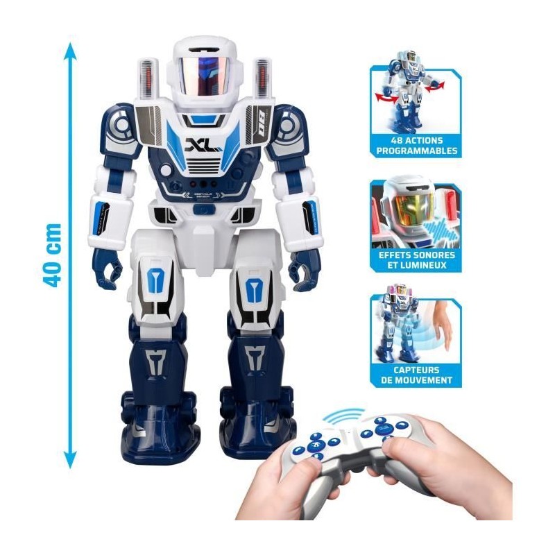 Le Robot Program a Bot XL de SILVERLIT mesure 40 cm et fonctionne en 2.4GHz. Il permet aux enfants des 5 ans de programmer jusqu'a 48 actions grâce a une télécommande intuitive, alliant amusement et apprentissage de la programmation. Un compagnon éducatif idéal !