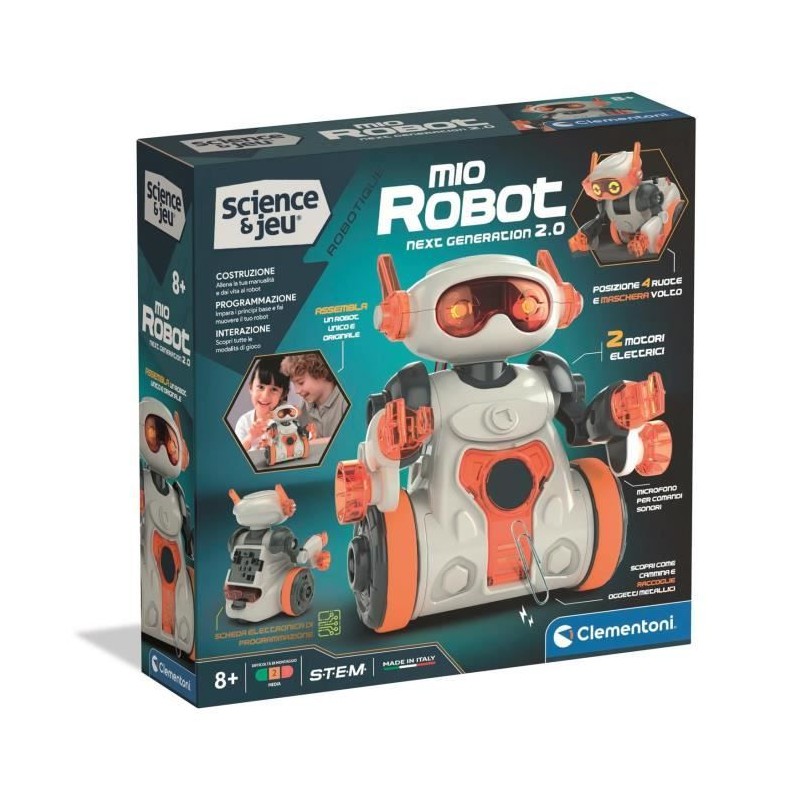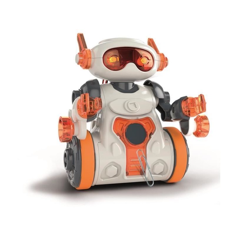 - Assemble les pieces, le moteur, les LED et la carte électronique pour donner vie a ton robot 2.0. - Une fois assembler, tu peux le piloter a partir de la carte électronique pour diriger ses mouvements et ses déplacements.