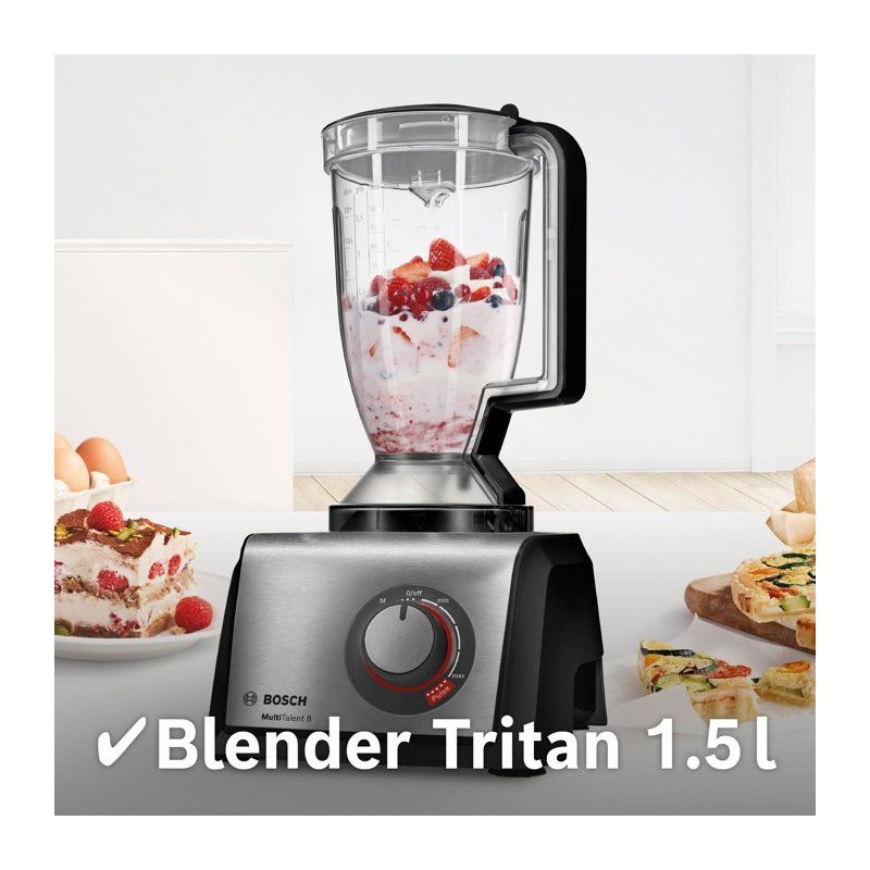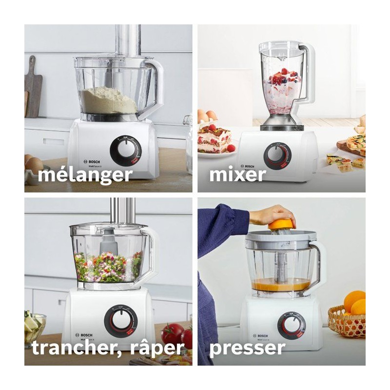 Le robot multifonction Bosch MultiTalent8 B1EMC812S8 est l'allié idéal pour cuisiner plus vite, plus facilement et avec toujours plus de créativité. Équipé d'un puissant moteur de 1250 W, d'un variateur électronique de vitesse avec affichage LED et d'une fonction Turbo, il réalise sans effort toutes vos préparations : hacher, mixer, pétrir, fouetter, râper, émincer... Son grand bol de 3,9 L permet de préparer de belles quantités, tandis que le blender 1,5 L élargit encore les possibilités. Cette édition limitée "Le bonheur est dans l'assiette" inclut un équipement complet : 2 disques multifonctions, un fouet inox, un pétrin, un presse-agrumes et meme un livre de 80 recettes pour ne jamais manquer d'inspiration. Avec son design blanc et inox brossé, élégant et moderne, il s'integre parfaitement dans toutes les cuisines. Un robot polyvalent, puissant et intuitif pour révéler votre créativité chaque jour.