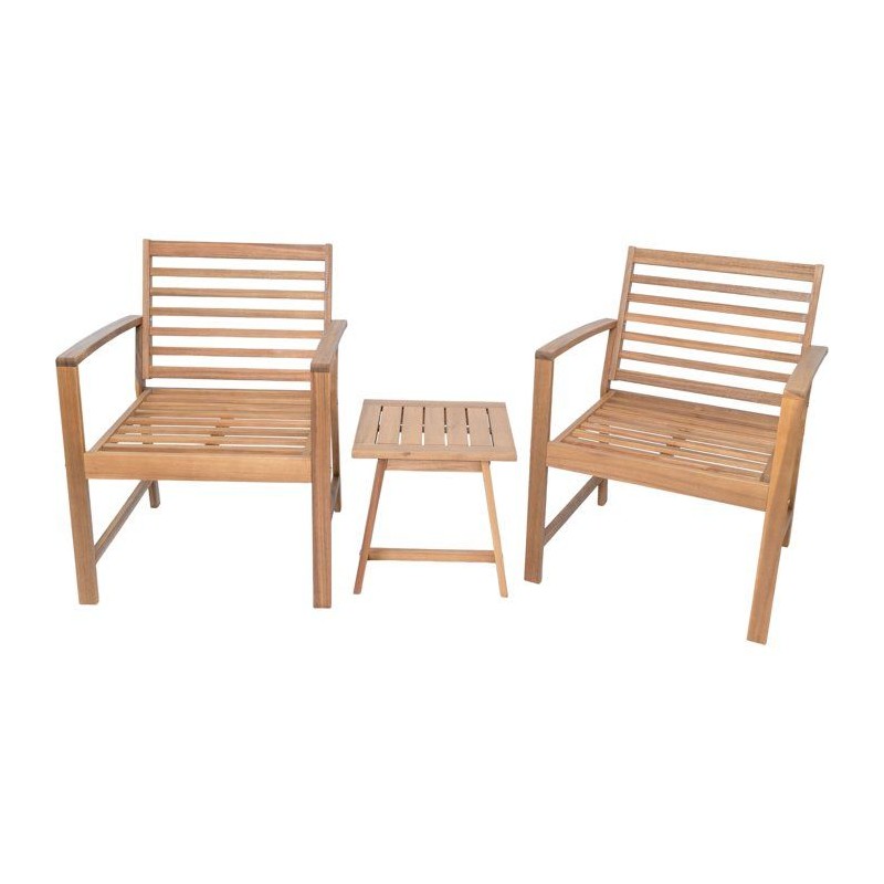 Cet agréable salon de jardin est fabriqué en bois d'Acacia certifié FSC. Il peut acceuillir 2 personnes et se compose de deux fauteuils et d'une table basse carré. Les coussins fournis assureront votre confort, et ils sont en polyester 200gr/m2.
