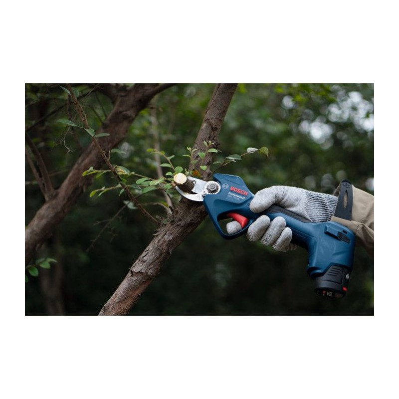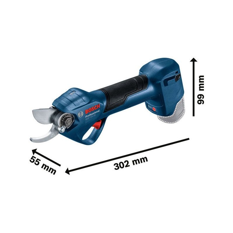 Sécateur professionnel Bosch Pro sans fil, idéal pour l'élagage et la coupe de pelouse. Lame de 2,5 cm, alimenté par une batterie lithium-ion de 12 V. Dimensions : 110 mm x 311 mm x 96 mm. Couleur : bleu.