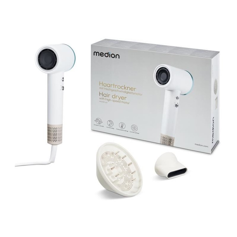 Seche-cheveux - MEDION - MD19983 - 1600 W - 2 vitesses - 85°C - Design LED - Blanc