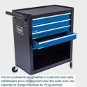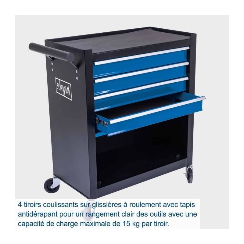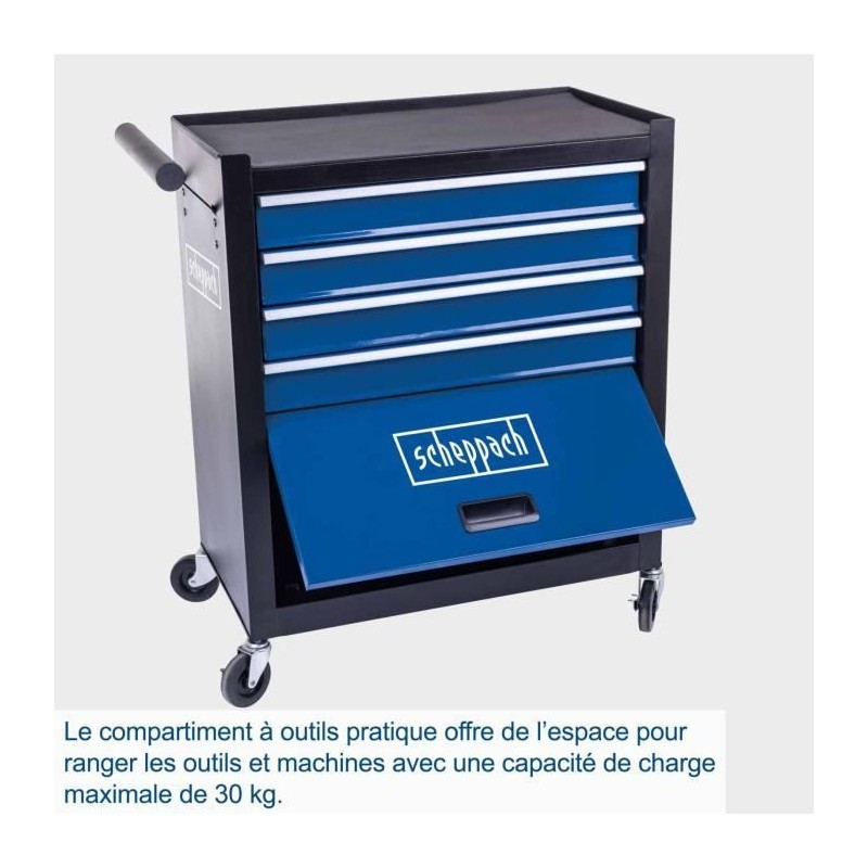 Servante d'atelier Scheppach TW1300 charge max 120kg,La servante d'atelier Scheppach TW1300 permet de ranger les outils et les machines de maniere claire et peu encombrante, ce qui en fait une aide pratique dans chaque atelier. Les quatre tiroirs sont munis chacun d'un tapis antidérapant et s'ouvrent et se ferment facilement grâce aux rails de guidage stables montés sur roulements a billes. La servante d'atelier peut