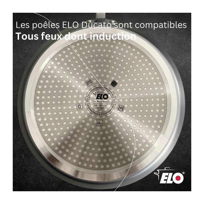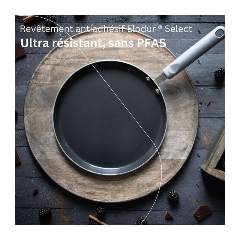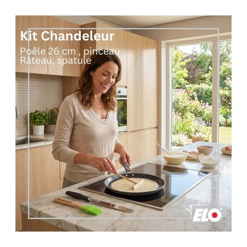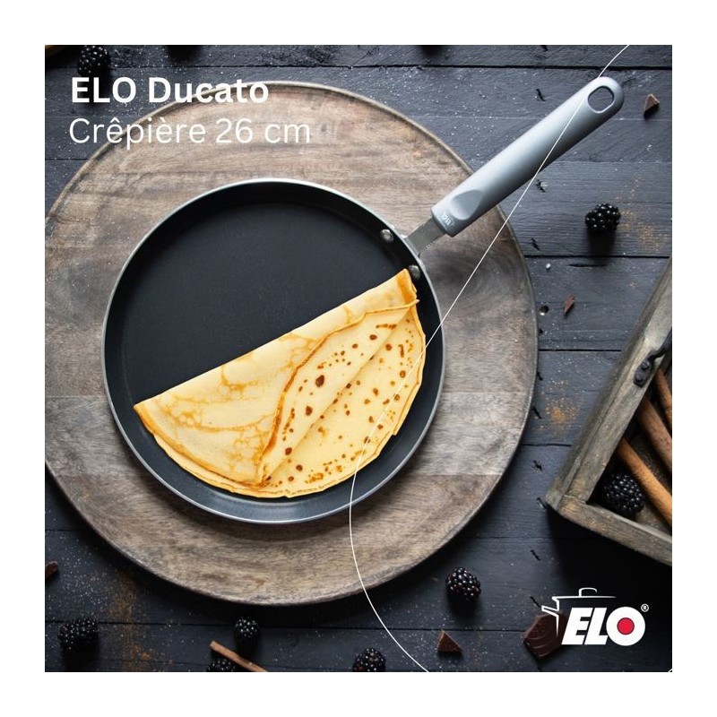 Set pour réaliser crepes, galettes ou pancakes : idéal chandeleur, brunch ou goûter. Crepiere 26 cm Elo Ducato avec revetement antiadhésif ELODUR® Select sans PFAS : cuisson légere, sans adhérence, distribution homogene de la chaleur. Compatible tous feux dont induction. Poignée ergonomique soft-touch. Inclus : pinceau silicone/bois résistant 230°C, râteau a crepes (rozell), spatule inox professionnelle (lame 25,9 cm). Parfait pour crepes fines et galettes.