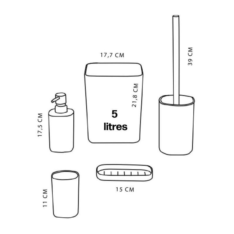 Ensemble de 5 accessoires de salle de bain de la gamme Utility comprenant : un distributeur de savon liquide, une poubelle, un gobelet porte-brosse a dents, un plateau porte savon et une brosse WC. Dimensions : distributeur de savon 17,5x7,5 cm, prte brosse a dents 11x7,3 cm, prte savon 15x13,5x1,5 cm, brosse WC 39x10 cm, pubelle 18x22 cm. Composition : plastique. Distributeur de savon liquide avec pompe. Plateau et gobelet brosse a dents en plastique étanches et faciles a nettoyer. Conçu pour répondre a vos premiers besoins. Les matériaux ont été choisis pour résister a l'humidité et au temps tout en offrant un design minimaliste. Retrouvez l'intégralité de nos objets malins pour la maison et équipez votre salle de bain grâce a notre gamme UTILITY. Design et couleur a petits prix.