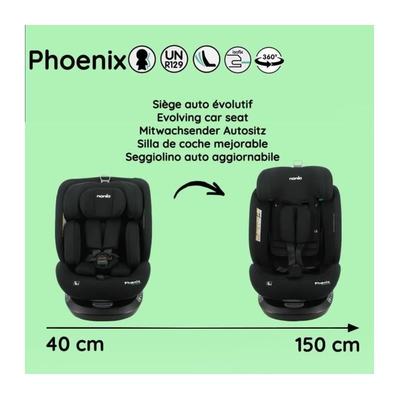 Le siege auto NANIA PHoeNIX est évolutif et accompagne votre enfant de la naissance jusqu'a 12 ans (40 a 150 cm). Homologué selon la norme i-Size R129, il garantit une sécurité optimale avec protections latérales et harnais 5 points. Son systeme pivotant a 360° en dos route facilite l'installation de bébé jusqu'a 4 ans. Il s'installe avec les fixations isofix et top tether pour une sécurité renforcée. La tetiere réglable en hauteur s'adapte a la croissance de l'enfant. Pour un confort maximal, il est équipé de coussins amovibles et propose plusieurs inclinaisons, idéales pour les siestes et les longs trajets.