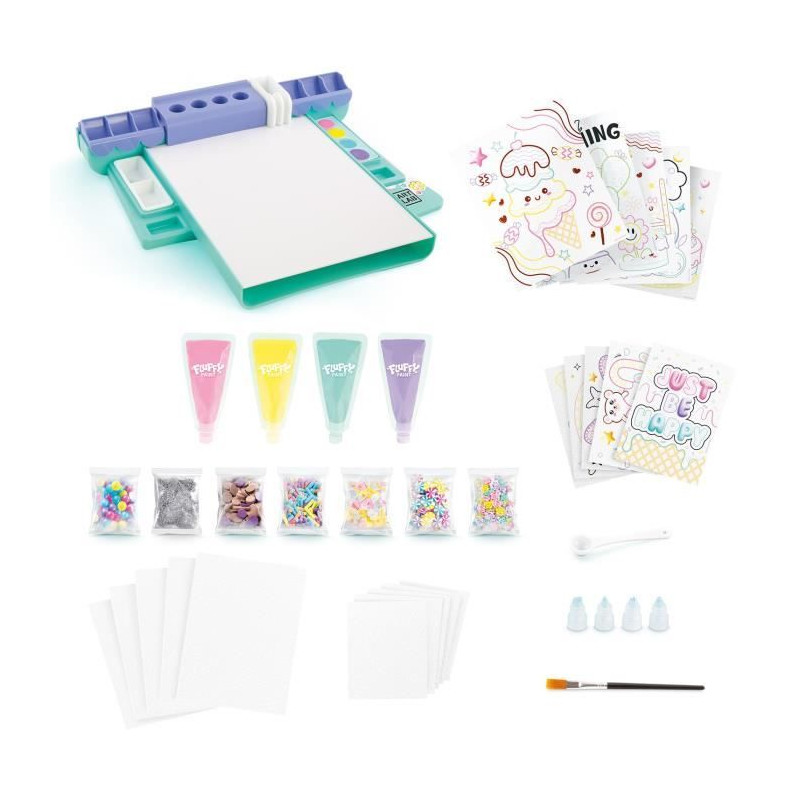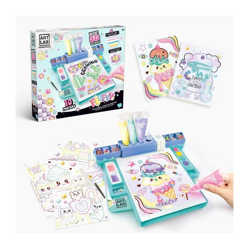 Créez des peintures 3D amusantes avec le Studio de peinture Fluffy ! Peignez le fond, choisissez une couleur et un embout pour des effets uniques. Le kit comprend tout le nécessaire pour réaliser 10 posters, idéal pour les enfants des 6 ans.