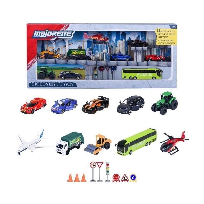 Retrouvez les véhicules de la vie quotidienne au format mini et en métal grâce a Majorette !_x000D_ _x000D_ Véritables passionnés ou simples amateurs vous trouverez votre bonheur parmi les nombreuses gammes que présente la marque !_x000D_ _x000D_ Ce grand coffret rassemble 10 modeles de véhicules a roues libres : hélicoptere, camion de recyclage, avion, Alpine de la Gendarmerie, Ford GT, tracteur Deutz, Rouleau compresseur, bus Man, Bugatti Chiron, et DS 7 E-Tense._x000D_ _x000D_ Afin d'agrémenter les fonctions de jeu et imaginer un univers plus complet, des panneaux de signalisation sont également inclus._x000D_ _x000D_ Vous serez vite séduit par ces véhicules a l'échelle 1/64eme !_x000D_ _x000D_ Ces petites voitures sont parfaites pour commencer une nouvelle collection !_x000D_ _x000D_ Ce coffret comporte l'ensemble des univers de la gamme Majorette._x000D_ _x000D_ A partir de 3 ans.