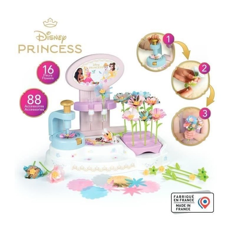 Avec ton Disney Princesses Marché aux fleurs tu vas pouvoir réaliser tes propres fleurs, et les offrir a tes parents et tes amis._x000D_ Réalise facilement et rapidement tes bouquets grâce a ta fabrique de fleurs._x000D_ Tu retrouveras tout le nécessaires pour réaliser les fleurs que tu aimes._x000D_ 88 accessoires inclus. A partir de 3 ans. Fabrication française.