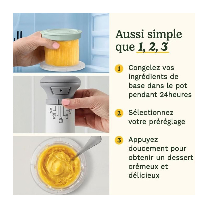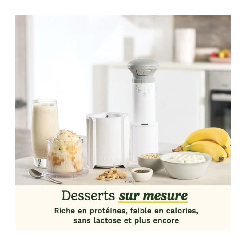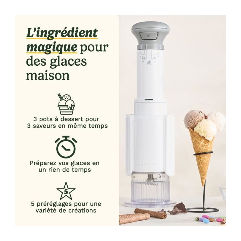 Découvrez la magie de la Cuisinart FreezeWand, une sorbetiere compacte et portative qui vous permet de préparer trois desserts glacés différents a la suite. Avec ses cinq programmes faciles a utiliser - glace, granité, milkshake, sorbet et ingrédients ajoutés - réalisez une variété de délices glacés en seulement 5 minutes. Ajoutez vos ingrédients frais et garnitures préférées pour des desserts personnalisés, qu'ils soient riches en protéines, sans lactose ou vegan. La fonction « ingrédients ajoutés » garantit une répartition homogene des pépites de chocolat, fruits frais et autres garnitures pour une texture parfaite. Facile a ranger grâce a ses pots empilables, cette machine est idéale pour les petites cuisines. Nettoyez rapidement les pots et couvercles compatibles lave-vaisselle et profitez de desserts glacés sans effort.