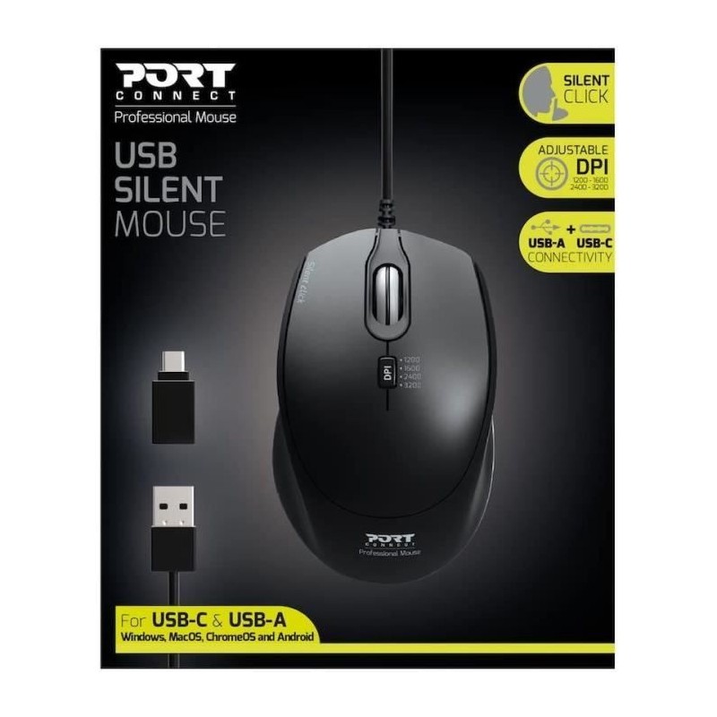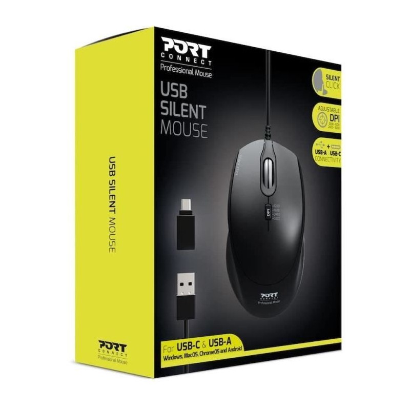 La souris filaire silencieuse PORT DESIGNS MOUSE OFFICE PRO SILENT WIRED est un périphérique d'entrée de technologie optique avec une molette de défilement et des touches silencieuses. Elle est compatible avec les ports USB et USB-C. Ses dimensions sont de 6.5 x 9.9 x 3.7 cm et son poids est de 98 g.