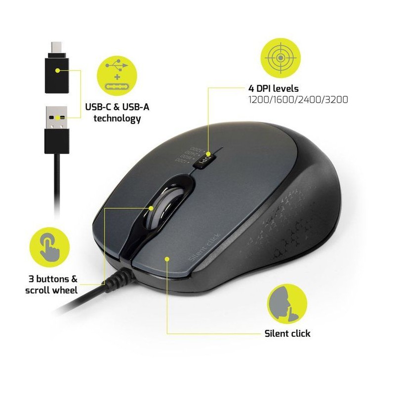 Ce produit est une souris filaire avec une double connectivité USB-A et USB-C, ce qui la rend compatible avec tous les appareils. Elle possede 4 niveaux de vitesse réglables pour une précision optimale.