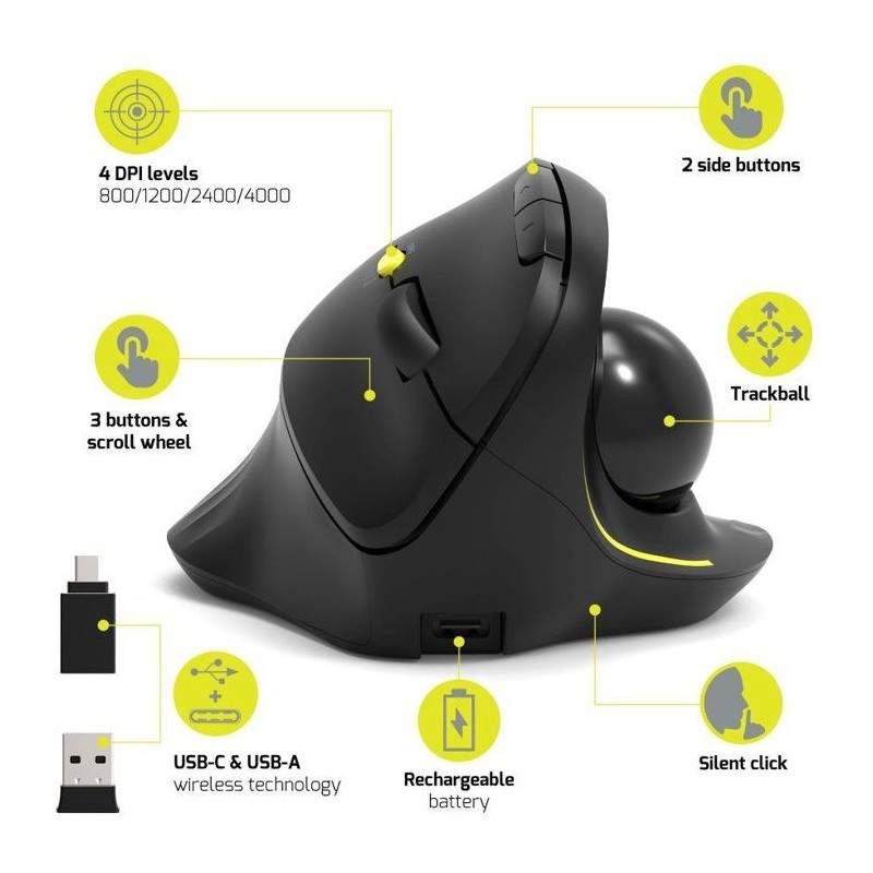 Souris sans fil - PORT Designs - 900719 TRACKBALL ERGO - Bluetooth & 2.4 GHz - Rechargeable - Noir