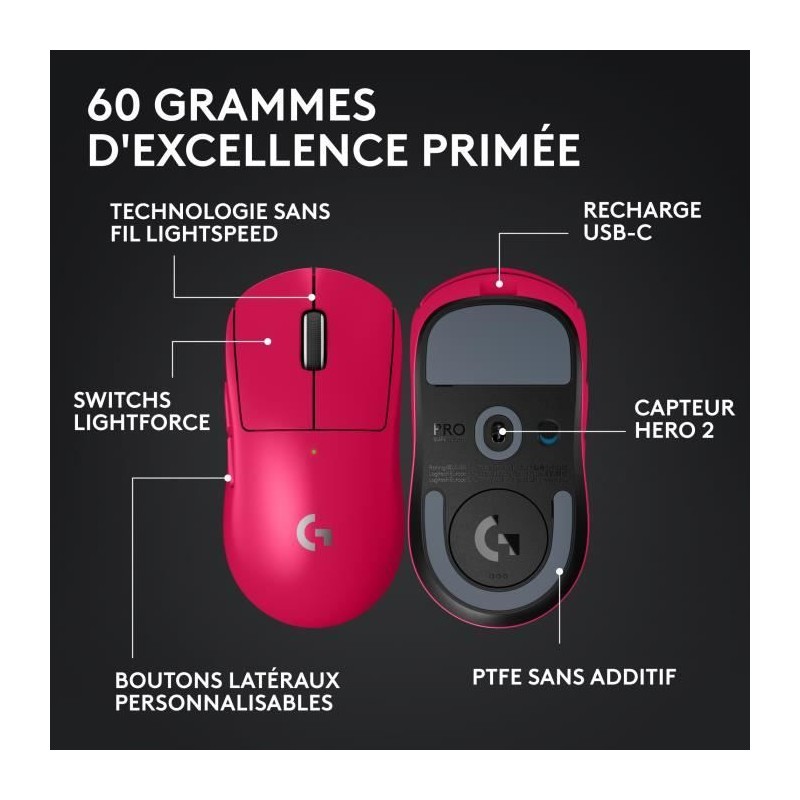 La souris gaming sans fil Logitech G PRO X Superlight 2 Magenta est conçue pour les joueurs Esport les plus exigeants. Avec son poids ultra-léger de 60 g, elle offre une précision et une rapidité exceptionnelles grâce a son capteur optique HERO 2 de 32 000 DPI et sa connectivité LIGHTSPEED.