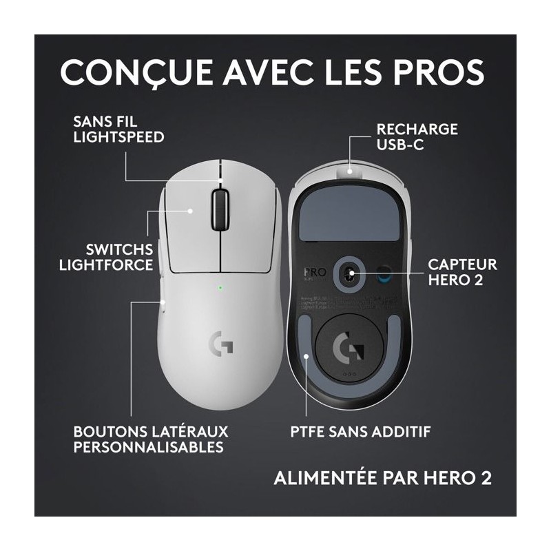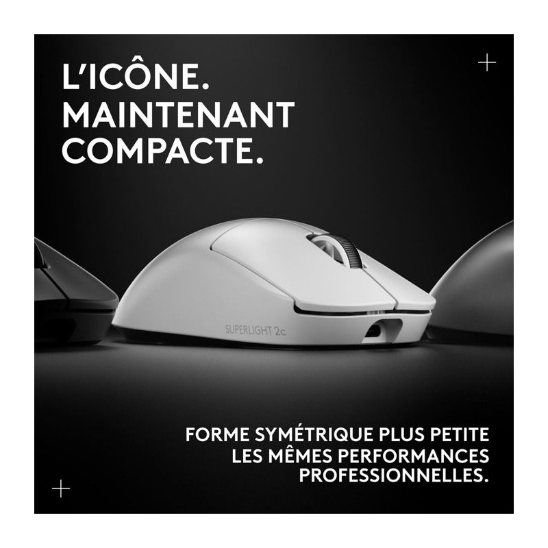 La souris gaming sans fil Logitech G PRO X Superlight 2c est une souris ultra-légere axée sur les performances, pour ceux qui préferent une forme de souris plus compacte en raison de la taille de leur main ou de leur style de prise en main.