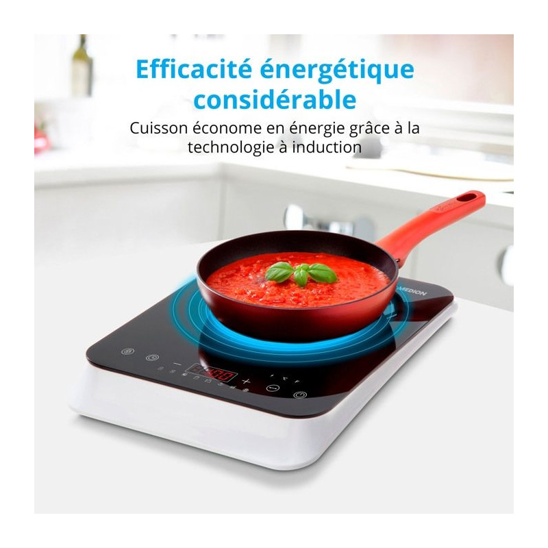 Plaisir de cuisiner garanti Avec la plaque a induction de MEDION, cuisiner redevient un plaisir et n'a jamais été aussi précis. Vous pouvez régler tres précisément la température lors de la préparation des repas. Ainsi, a l'avenir, plus rien ne brûlera au fond de vos casseroles. C'est possible grâce a la technologie de l'induction, qui permet en outre d'économiser beaucoup d'énergie. La chaleur est directement transmise au fond des casseroles et des poeles et réchauffe ainsi vos aliments sans détours. Effet secondaire positif : vous gagnez un temps précieux ! La sécurité avant tout La plaque de cuisson a induction assure une plus grande sécurité dans votre cuisine. L'énergie est directement dirigée la où elle est nécessaire. La plaque de cuisson reste relativement froide. Seule la chaleur dégagée par les casseroles et les poeles chauffe la cuisiniere, ce qui minimise le risque de brûlure. Si vous avez oublié d'éteindre la plaque a induction, ce n'est pas un probleme non plus : sans casserole sur la plaque, rien ne chauffe non plus - ce qui permet d'économiser de l'énergie et de ne pas s'inquiéter des plaques de cuisson non éteintes.