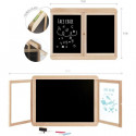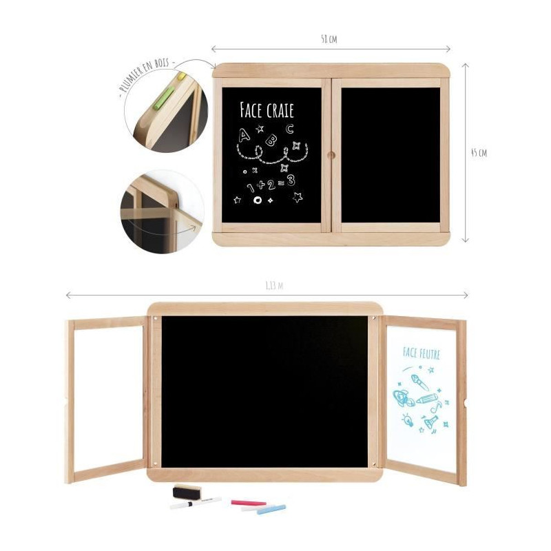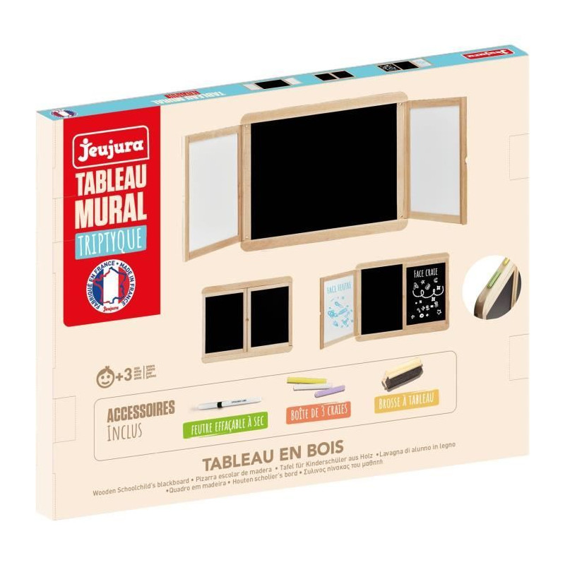 Ce tableau mural triptyque JEUJURA est parfait pour les enfants. Il comprend une ardoise centrale pour craie et deux volets, l'un blanc et l'autre en ardoise. Dimensions ouvertes : 113 x 45 cm, fermé : 58 x 45 cm. Idéal pour une utilisation intérieure.