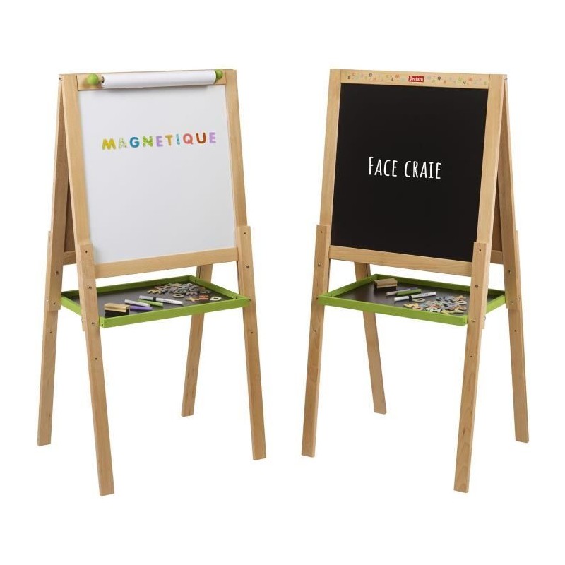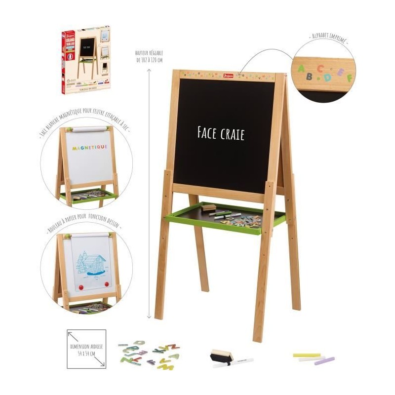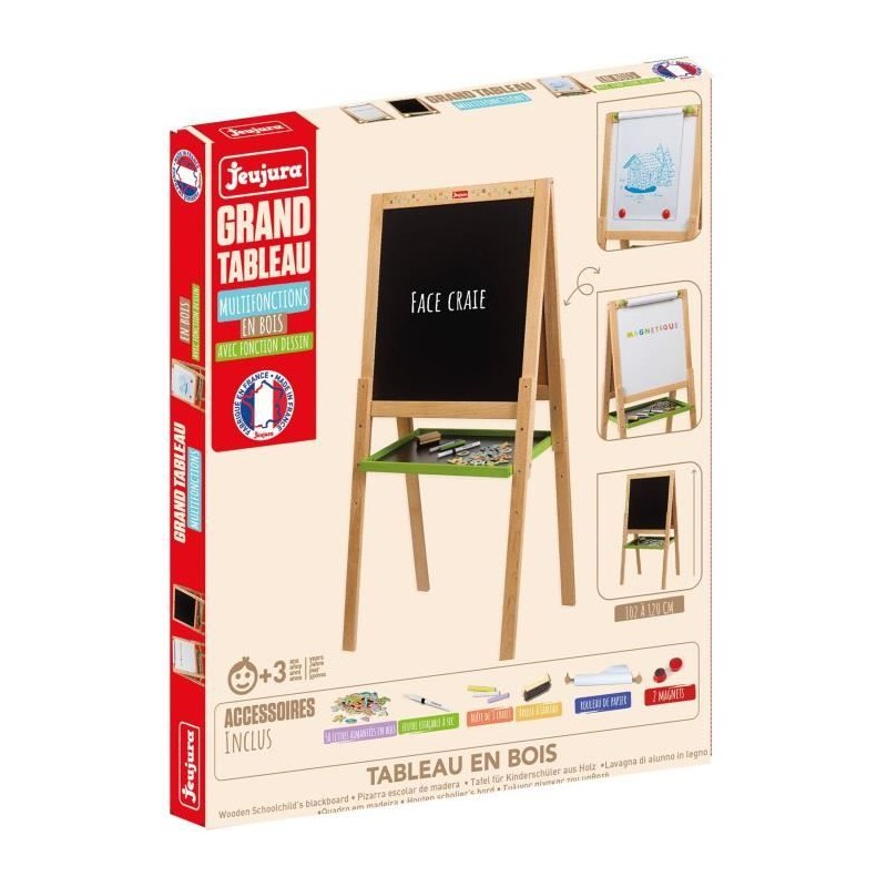 Découvrez le grand tableau multifonctions en bois JEUJURA, idéal pour les enfants a partir de 3 ans. Il comprend une ardoise a craie, une face blanche magnétique, une tablette teintée et des pieds ajustables. Dimensions : 54 x 54 cm. Parfait pour stimuler la créativité des petits.