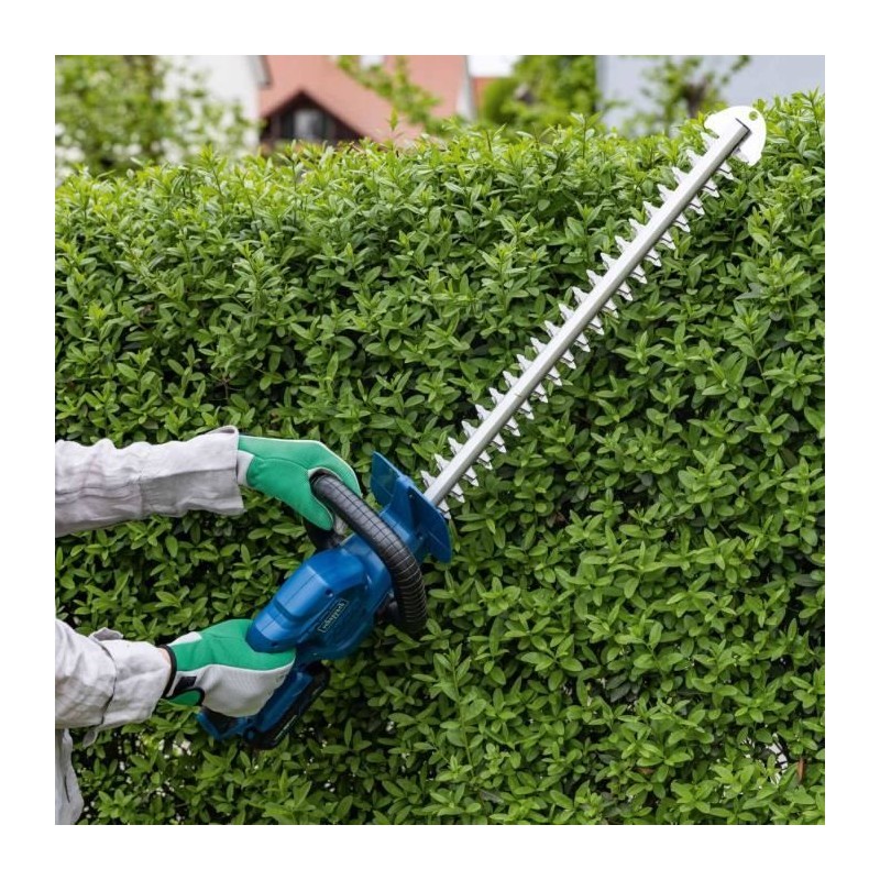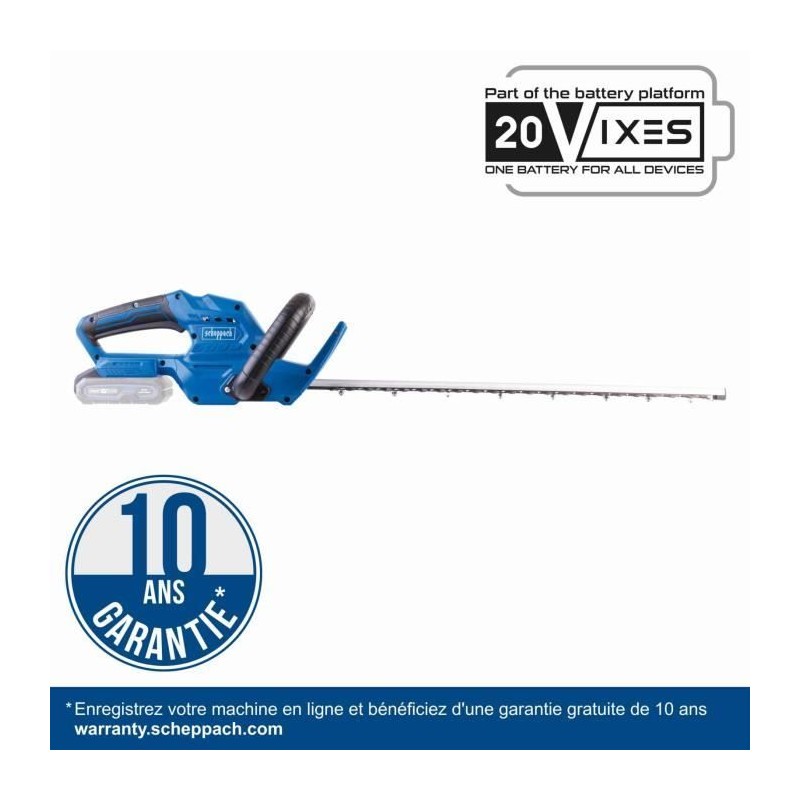 Puissant taille-haie sans fil pour la taille facile et fiable de haies et buissons, Travailler sans fil avec la Série Scheppach IXES 20 Volts : toutes les batteries et chargeurs de la gamme peuvent etre combinés avec le taille-haie sans fil, Lamier robuste de 560 mm avec 2400 coupes/minute et une longueur de coupe de 510 mm, Convient pour un diametre de branches de 16 mm maximum, Lames double action découpées au laser avec barre de guidage en aluminium et étrier de protection avec perçage pour accroche murale du taille-haie assurant ainsi un rangement peu encombrant, Interrupteur de sécurité a 2 mains, avec arret rapide, assure une sécurité maximale pendant le fonctionnement, Poignée ergonomique Softgrip, Livré avec un fourreau de protection, Compend une batterie Scheppach IXES 2 Ah - 20 V et un chargeur 2,4 A