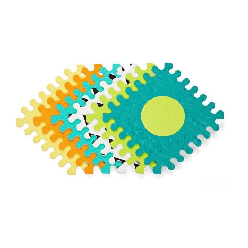 De la marche a 4 pattes jusqu'aux premiers pas : ce tapis en mousse tres épais crée un espace mou et sans danger pour l'enfant. Les pieces texturées permettent une interaction sensorielle précoce et les formes détachables a encastrer stimulent la reconnaissance des formes.