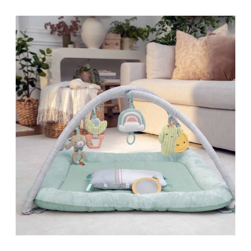 Vous souhaitez offrir a bébé un espace de jeu chic et sûr qui s'integre parfaitement a votre décor ? Le tapis d'éveil Calm Springs Plush est la solution parfaite pour les parents a la recherche d'un tapis d'éveil ultra-doux, a la fois douillet et divertissant. Ce tapis d'éveil super moelleux, spécialement sélectionné pour la peau douce de bébé, est doté d'un tissu Bliss Blend de premiere qualité, composée de bambou (70 %) et de coton (30 %). Son matelassage ultra-doux est parfait pour que bébé s'y allonge et s'y amuse. Inspiré du désert californien de Palm Springs, bébé aura sa propre oasis de calme haut de gamme pour se détendre. Le tapis d''veil au sol est équipée de 6 jouets d'activités détachables inspirés du désert, dont un miroir en rotin boho chic, un coussin pour apprendre a bébé a s'allonger et a jouer, un arc-en-ciel en peluche qui joue une mélodie apaisante, un pot de fleurs en caoutchouc naturel avec un jouet qui se froisse, un miroir solaire en tissu doux, et le lapin en peluche Sylvi avec un anneau en bois naturel - autant de jouets chics que votre bébé chérira. C'est l'endroit idéal pour jouer ou se détendre !
