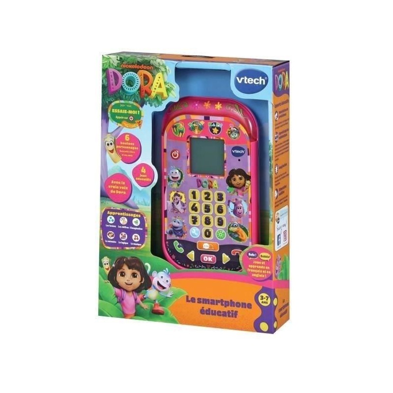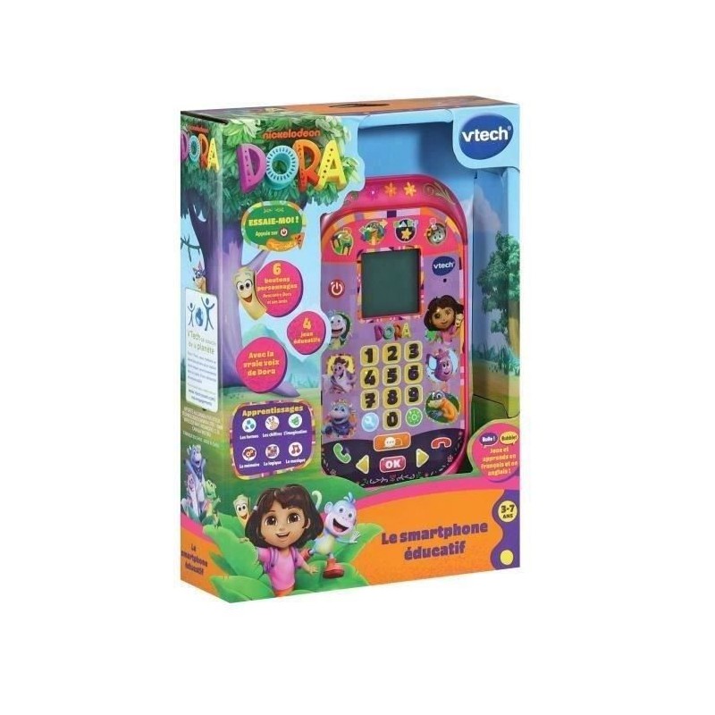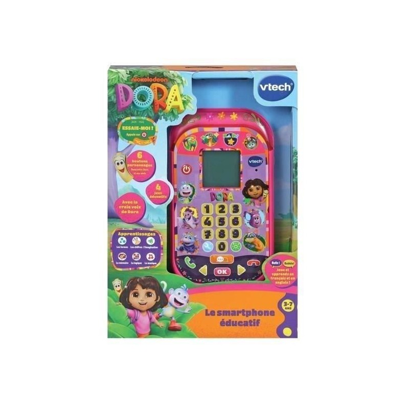 Dora - Le smartphone éducatif (bilingue) - 3 - 7 ans Un téléphone bilingue et lumineux pour apprendre et jouer avec les personnages de la série Dora ! L'écran LCD anime les héros de la série, Dora, Babouche, Sakado et La carte a travers : - 4 jeux pour découvrir les chiffres, les formes, apprendre a compter en frança