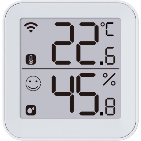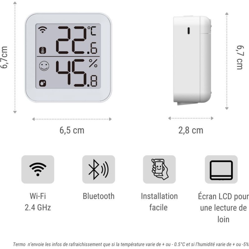 Termo 2,Thermometre hygrometre Wi-Fi,Surveillez la température intérieure pour faire des économies, Grand écran plus lisible a distance, Smiley d'évaluation du confort en un coup d'oeil, Installation automatique avec le Bluetooth, Détecteur de température et d'humidité consultable a distance. Notifications sur Smartphone, exportation des données. Autonomie 1 an ou plus avec 3 Piles AA Standards, scénarios faciles pour piloter d'autres appareils.