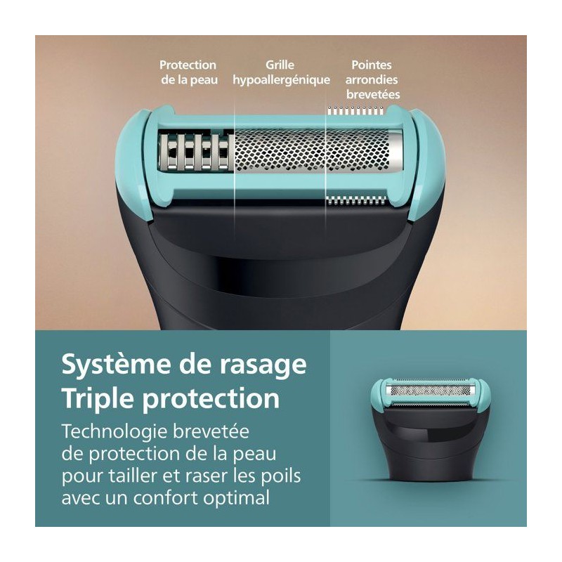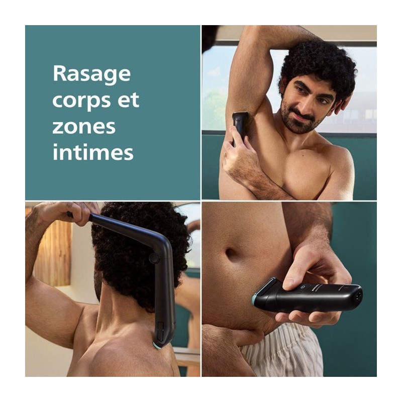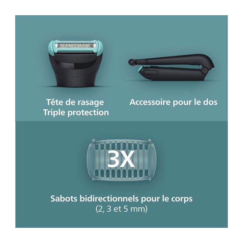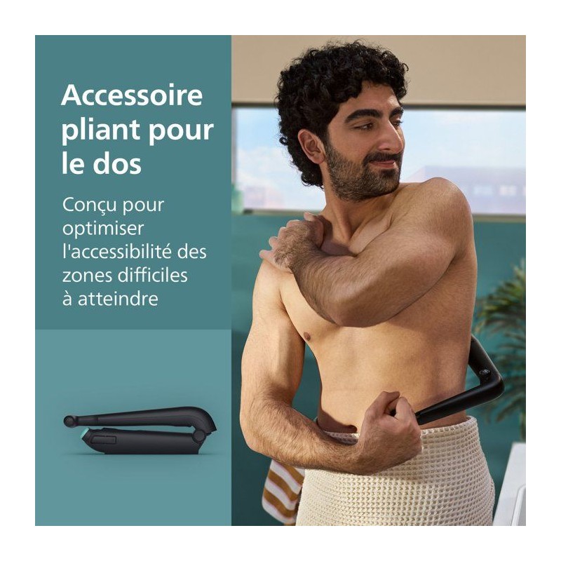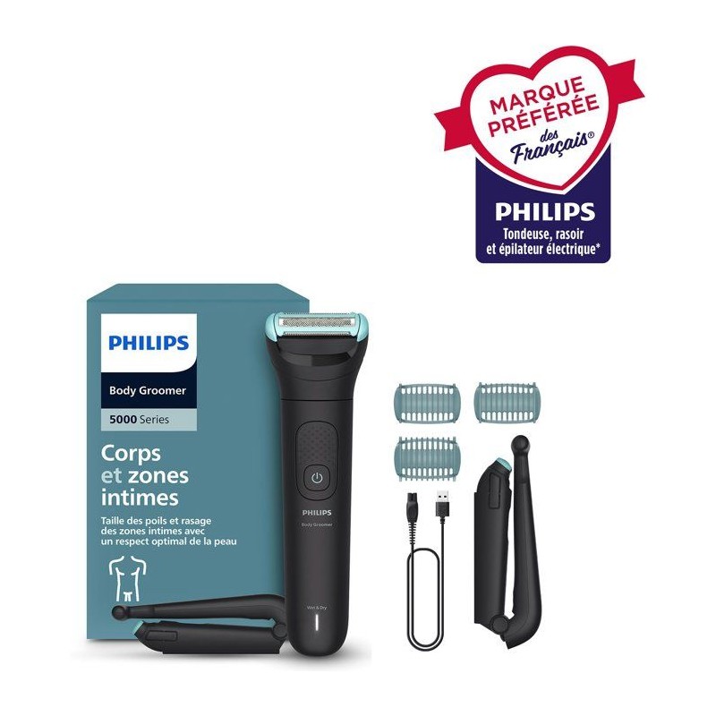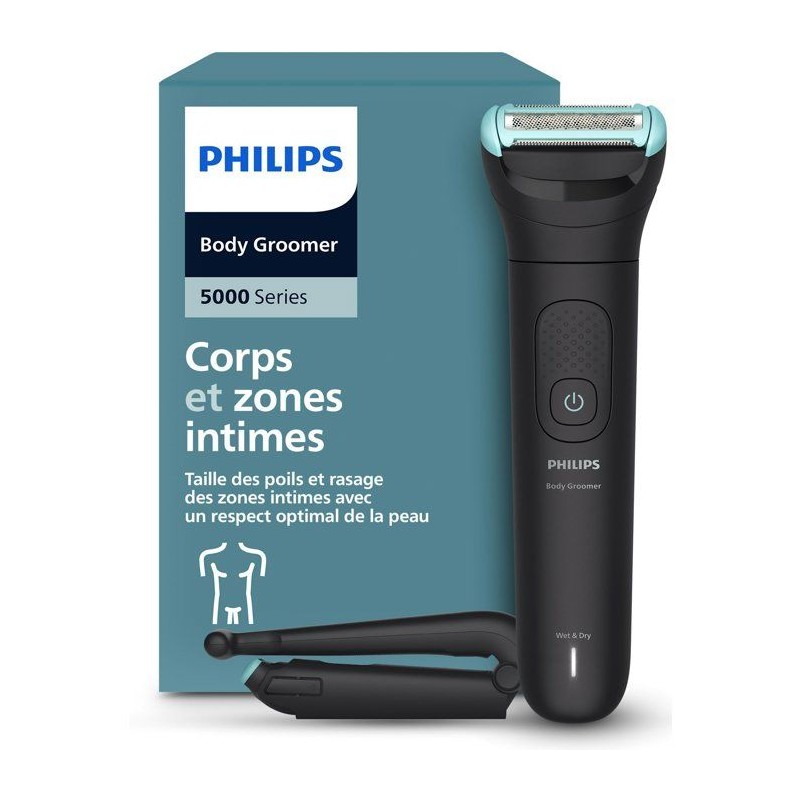 Philips BG5475/15 Series 5000 Noir et BleuRasage du corps et des zones intimes respectueux de la peau Systeme de rasage Triple Protect et sabots de coupe : Profitez d'un rasage de pres en douceur sur tout votre corps, y compris les zones intimes, sans transiger sur le confort de votre peau. Il existe 3 hauteurs de coupe pour une taille polyvalente, et l'accessoire dos pliable permet d'atteindre les zones difficiles d'acces. Systeme de rasage Triple Protect :Le systeme de rasage Triple Protect est doté de dents perlées pour encore plus de confort, de trous en forme de losange pour un rasage sans effort ainsi que d'une grille qui réduit considérablement les irritations cutanées Accessoire dos pliable :Le nouvel accessoire dos pliable offre une meilleure ergonomie et facilite considérablement l'accessibilité sur tout le corps. Le manche propose différents réglages pour un rasage confortable de tous les côtés. Jusqu'a 100 minutes d'autonomie :La batterie au lithium durable offre jusqu'a 100 minutes d'autonomie, avec une option de charge rapide en 5 minutes, pour une expérience de coupe puissante, sans interruptions. Coupe de pres :Avec une précision de rasage de 0,2 mm, notre technologie de coupe vous offre le rasage de pres que vous attendez. La grille de rasoir en forme de losange permet d'obtenir une finition lisse et uniforme, laissant votre peau douce etfraîche. Sabots corps bidirectionnels :Choisissez parmi les longueurs de 2, 3 ou 5 mm selon vos goûts : les sabots bidirectionnels taillent dans toutes les directions pour un rasage facile et efficace sur l'ensemble du corps, meme les zones intimes. Indicateur de niveau de charge :L'indicateur de batterie vous informe du niveau de la batterie, qu'elle soit faible, vide, entierement chargée ou en charge, ce qui vous permet d'etre toujours pret pour la prochaine utilisation. S'utilise sous la douche :La tondeuse corps est étanche a 100 % et vous pouvez l'utiliser sur peau seche ou humide pour une utili