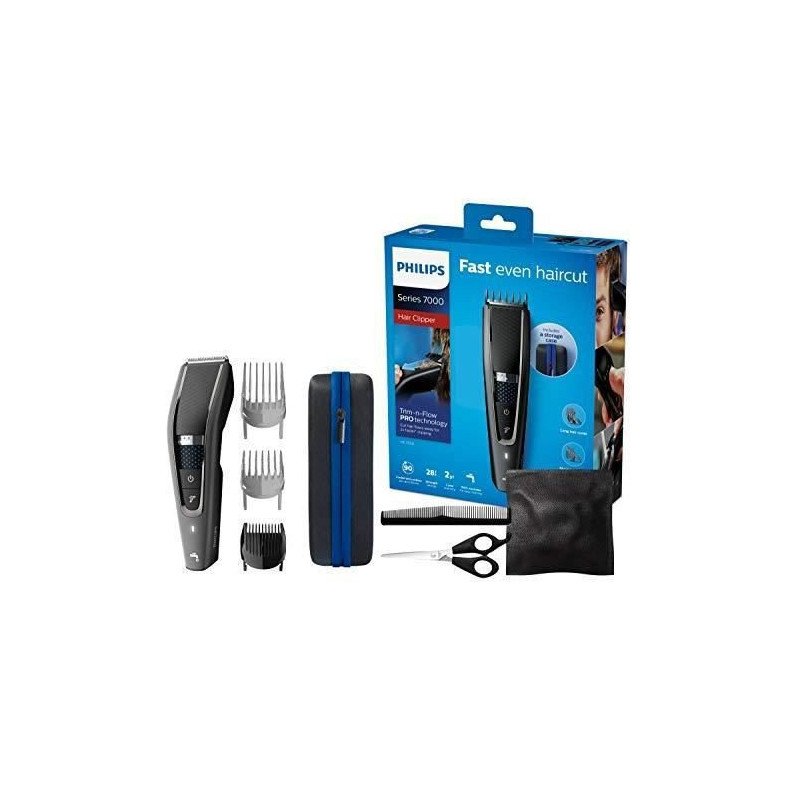 PHILIPS - Tondeuse a cheveux et barbe Série 7000 - 3 sabots (2 cheveux + 1 barbe) - Technologie Dualcut & Trim-n-Flow - 28 hauteurs de coupe (pas 1mm) - Mode Turbo - 100% étanche - 90min autonomie/1h de charge - rechargeable ou secteur - Trousse de transport - Kit barbier: peigne, ciseaux, cape
