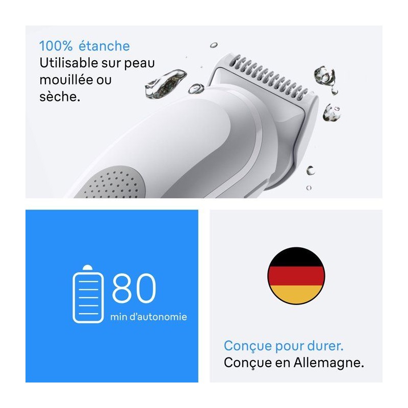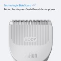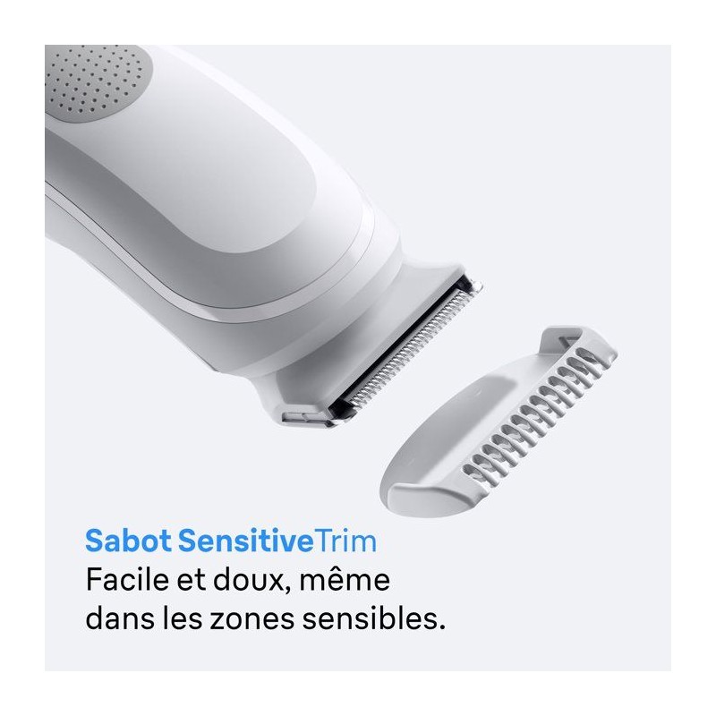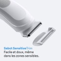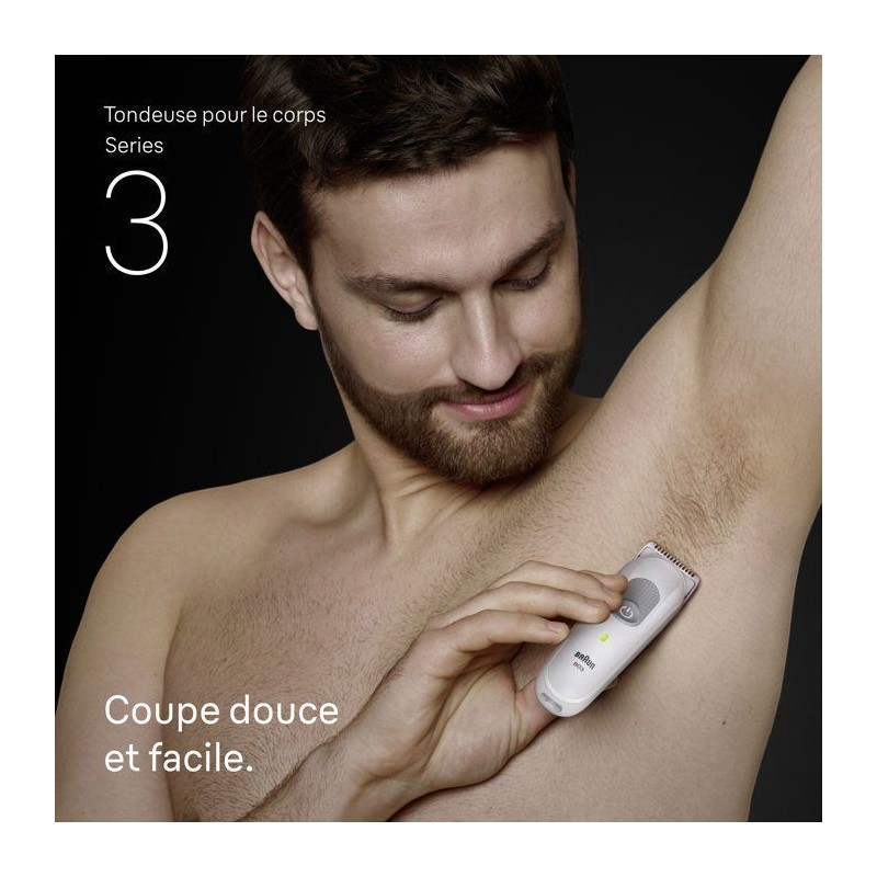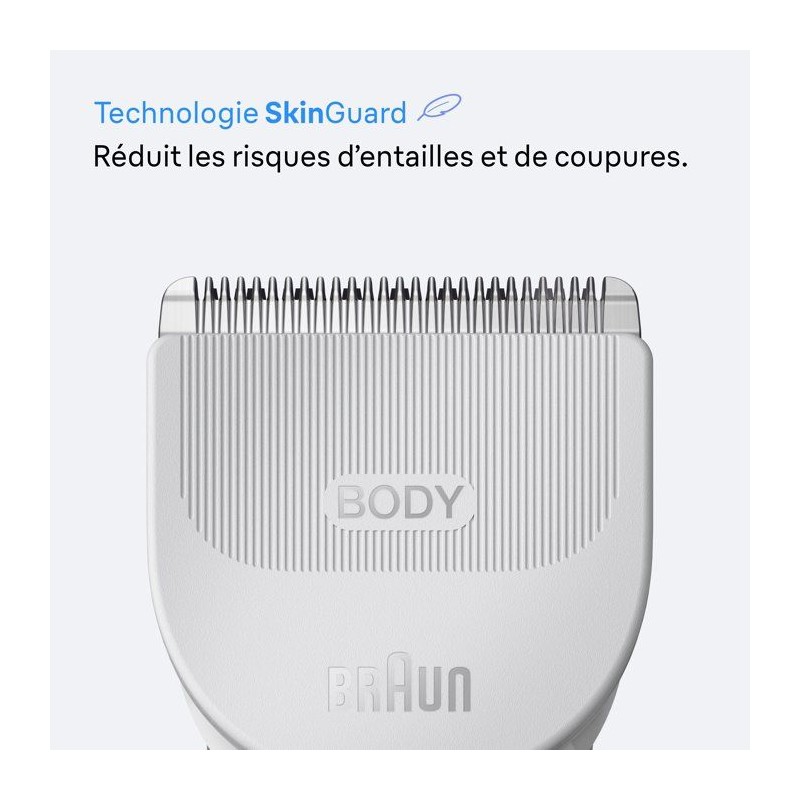 La tondeuse pour le corps de Braun, pour hommes, protege les peaux sensibles. Cet outil de rasage est doté de la technologie SkinGuard pour réduire les risques d'entailles et de coupures, vous permettant ainsi de vous raser partout. La tondeuse est fournie avec un sabot détachable pour les zones sensibles afin de garantir une expérience de rasage sûre et confortable, en évitant le contact de la peau avec la lame. La tondeuse, en gris clair, est conçue pour durer, est 100% étanche et est dotée d'une batterie offrant une autonomie de 80 minutes.