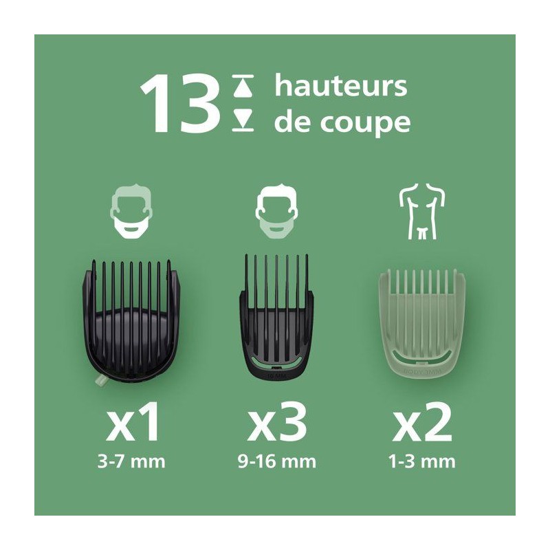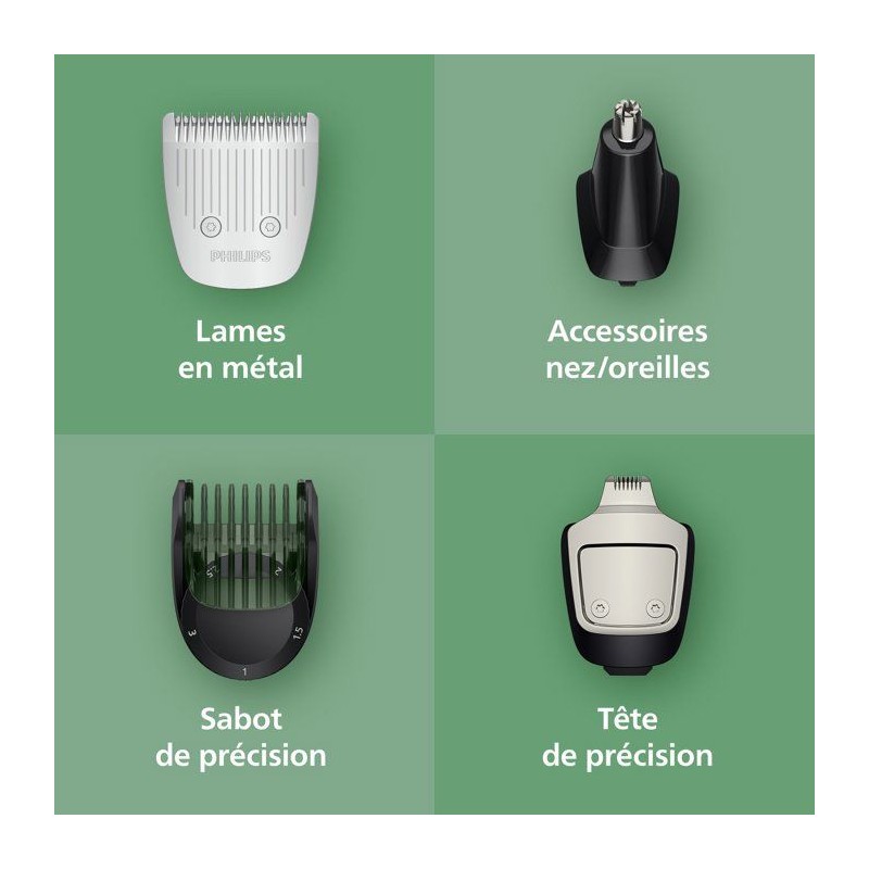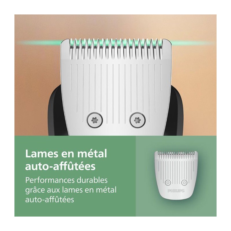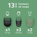 La Philips Series 5000 MG5941/15 est une tondeuse 11-en-1 conçue pour entretenir le visage, les cheveux et le corps. Ses lames en acier auto-affûtées assurent une précision durable, tandis que la technologie BeardSense ajuste automatiquement la puissance en fonction de la densité de la barbe. Ses 11 accessoires et 13 hauteurs de coupe (0,5 a 16 mm) permettent un style parfaitement maîtrisé : barbe, moustache, cheveux, contours et zones sensibles. 100 % étanche, elle s'utilise sous la douche et se nettoie facilement. Dotée d'une autonomie de 120 minutes et d'une recharge rapide de 5 minutes, elle garantit une utilisation flexible, précise et confortable au quotidien.