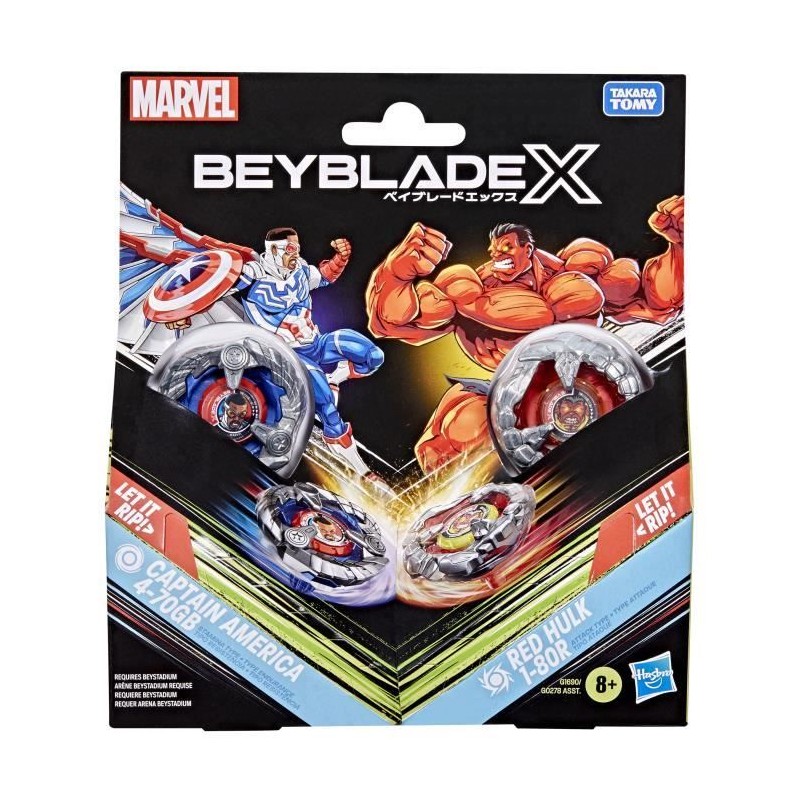 Beyblade X Multipack Toupie Captain America 4-70GB contre Red Hulk 1-80R, 2 BX, toupies de compétition Takara Tomy, 2 lanceurs, des 8 ans, Collaboration Beyblade X et Marvel
