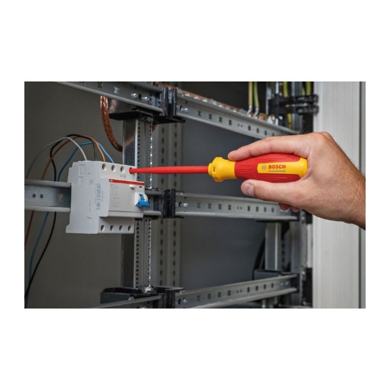 Le tournevis isolé VDE PH1x100 de Bosch est conçu pour les professionnels. Certifié jusqu'a 1000 V, il est fabriqué en élastomere thermoplastique pour une sécurité optimale. Sa tige fine et son embout robuste assurent un ajustement parfait, tandis que son manche ergonomique offre un confort d'utilisation. Idéal pour travailler en toute sécurité sur des installations électriques.