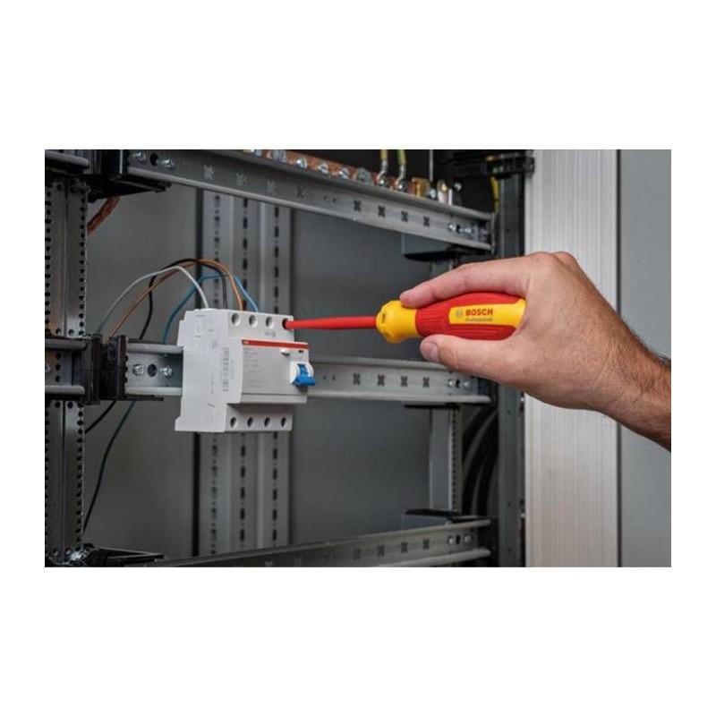 Le tournevis isolé VDE TX25x100 de Bosch Professional est conçu pour les professionnels. Il permet de travailler en toute sécurité avec des pieces sous tension, certifié jusqu'a 1000 V. Sa tige fine, son embout robuste et son manche ergonomique en TPE garantissent confort et précision. Idéal pour un usage intensif, il est antidérapant et facile a manipuler.