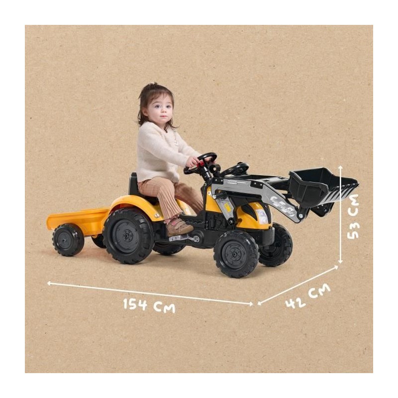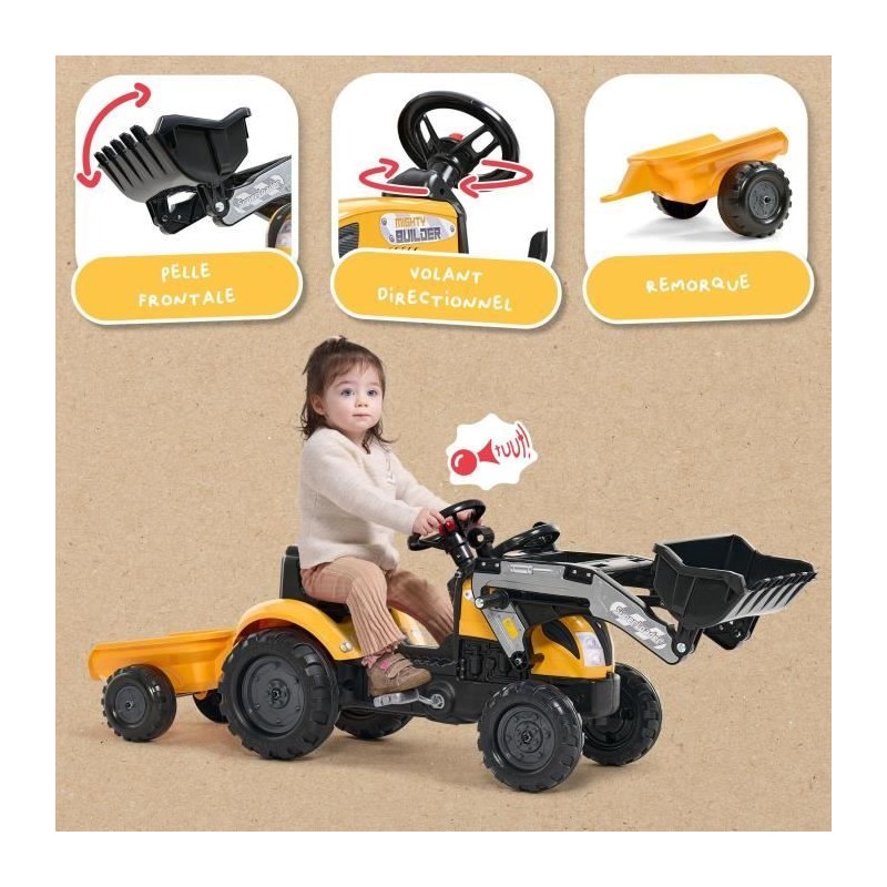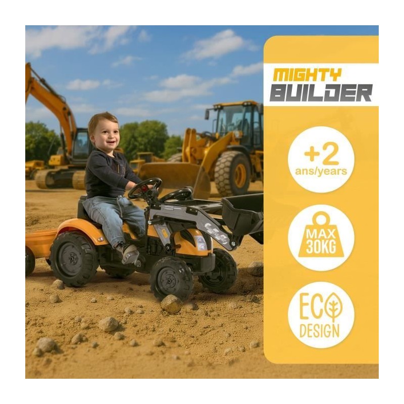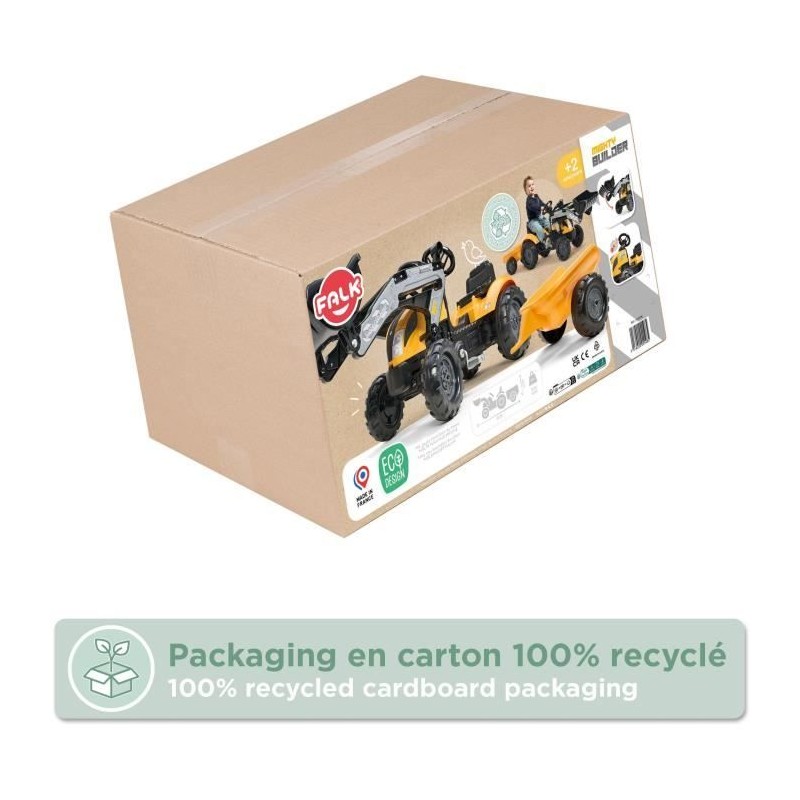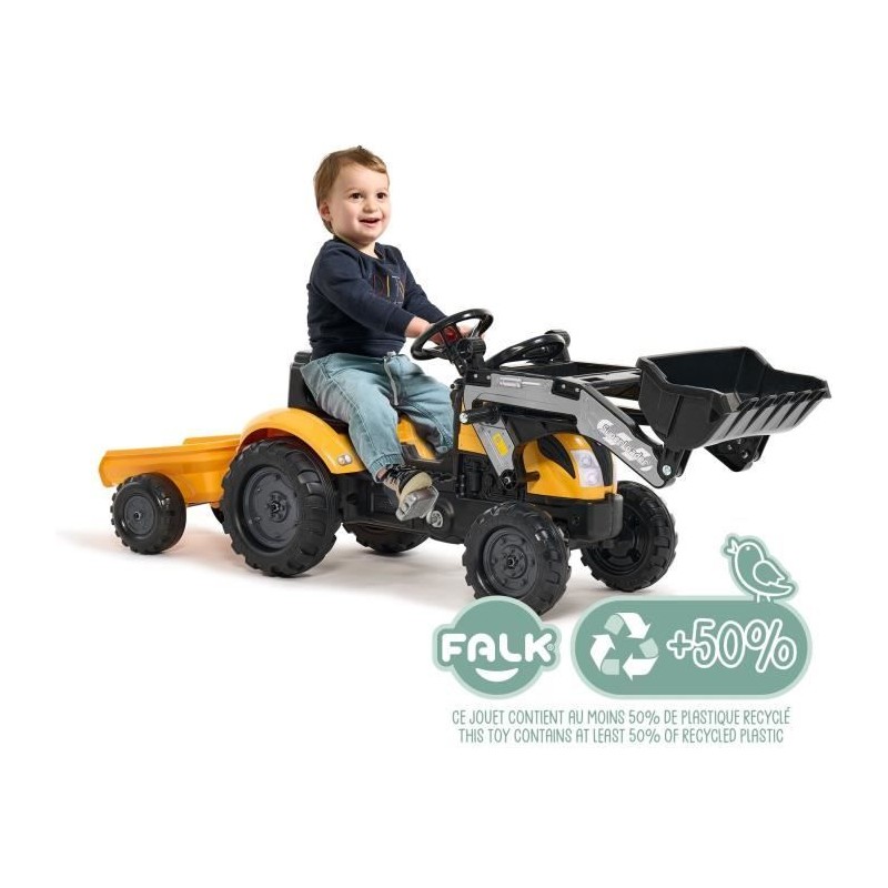Tracteur a pédales Mighty Builder - FALK - Avec remorque - Jaune - 100% Fabriqué en France - 50% de plastique recyclé - Des 2