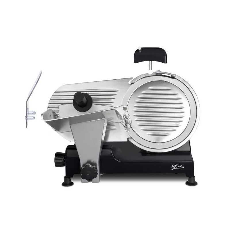 Trancheuse a viande - H.KoeNIG - MSX250 - Lame 25 cm. Dotée d'une lame italienne de haute qualité, vous pouvez trancher tous vos aliments a la perfection grâce a son diametre de 250 mm. Réglez la découpe (de 0 a 12 mm) pour adapter la trancheuse a vos besoins : chiffonnade de jambon, carpaccio de boeuf, tranche de pain, fruits, fromage... Puissante, rapide et silencieuse grâce a son moteur asynchrone de 240 watts et 282 tr/min. Pratique avec son aiguiseur de lame intégré pour un résultat optimal de coupe et son large plateau pour faciliter le positionnement d'un gros jambon. Ses 4 pieds antidérapants suppriment les risques de chute ou d'instabilité. La trancheuse a viande MSX250 : pour une découpe précise !