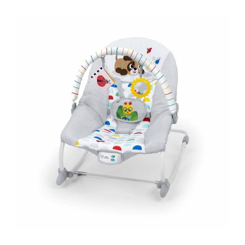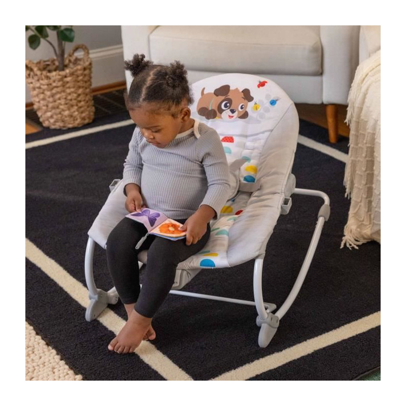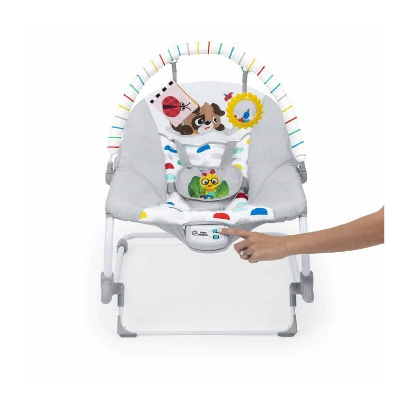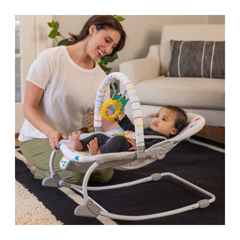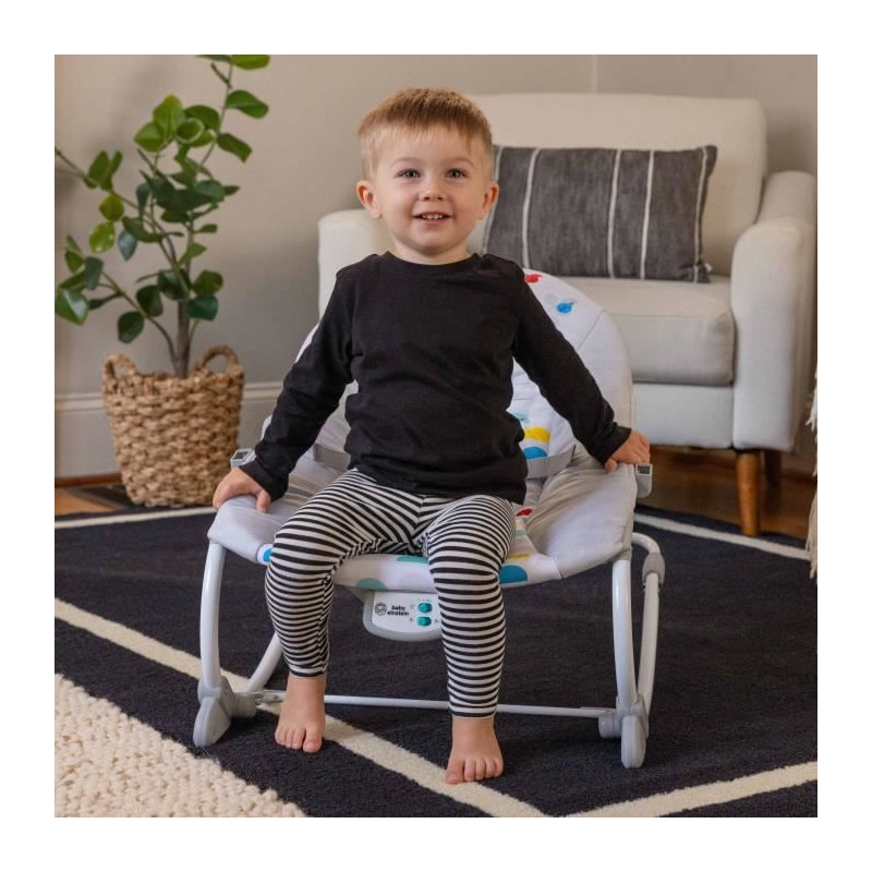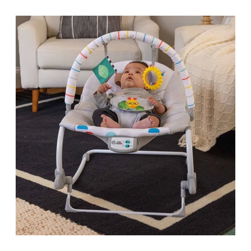 Un siege, deux façons de calmer et de jouer pour les bébés de 0 mois et plus grands ! Le transat Rocker Baby Einstein Dean's Discovery Spot Musical Infant to Toddler est le siege parfait pour calmer et amuser bébé pendant que vous avez les mains libres pendant quelques instants. Fabriqué aux USA par #1 Manufacturer of Bouncers*, votre enfant est au calme, il profite de la musique et éveille ses sens, assis ou en mode balancelle. Apaise et amuse bébé avec plus de 20 minutes de mélodies et vibrations. Les adultes font balancer le siege pour un bébé au calme ou utilisent la poignée arriere pour un siege en mode fixe. Avec 2 jouets suspendus sur la ribambelle pour que bébé tapote et attrape : soleil hochet et livre bruissant. Quand bébé grandit, retirer l'arc d'activités et déverrouiller la poignée pour transformer le siege en transat rocker ! Avec Dean le chien. Dimensions : 71 x 49 x 60 cm. Fonctionne avec 3 piles C (non incluses). Housse de siege lavable en machine. 2 positions de siege. Poids maximum pour l'utilisation : 18kg. harnais de sécurité a 5 points. Sécurité testée et approuvée par tierce partie. Ne pas utiliser pour dormir. (*Circana, Retail Tracking Service, U.S., Bouncers, dollar sales, 12 mois se terminant en octobre 2023)