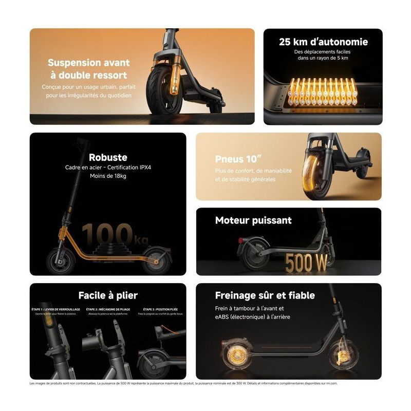 La trottinette électrique Xiaomi offre une conduite urbaine confortable et sécurisée grâce a son moteur de 300 W (500 W en pic) permettant de franchir des pentes jusqu'a 15 % et d'atteindre une vitesse maximale de 25 km/h conforme a la législation française. Elle est équipée de pneus pneumatiques 10" offrant un excellent confort d'amorti sur le bitume et l'asphalte, tandis que la suspension avant a double ressort (25 mm de débattement) améliore la stabilité sur les irrégularités de la route. Son systeme de freinage combine un tambour avant puissant et un frein électrique arriere E-ABS pour un contrôle optimal. Les feux avant et arriere automatiques assurent une visibilité renforcée lors des déplacements quotidiens. Sa batterie Li-ion de 216 Wh permet jusqu'a 25 km d'autonomie et se recharge en environ 8 heures. L'indice de protection IPX4 pour le châssis et IPX6 pour la batterie garantit une bonne résistance aux projections d'eau. La trottinette integre le Bluetooth et se connecte a l'application Xiaomi Home pour activer des fonctionnalités intelligentes telles que le rappel de gonflage des pneus, le verrouillage du moteur ou l'allumage automatique des feux. Conçue pour un usage quotidien, elle dispose d'un deck large avec repose-pied arriere incliné a 30°, d'un châssis en acier au carbone robuste et supporte une charge maximale de 100 kg. Pratique et simple a transporter, elle pese environ 18,1 kg et se replie en quelques secondes pour atteindre une hauteur de seulement 555 mm une fois pliée. Idéale pour les trajets urbains, elle offre un équilibre parfait entre performance, confort et compacité pour accompagner tous vos déplacements.