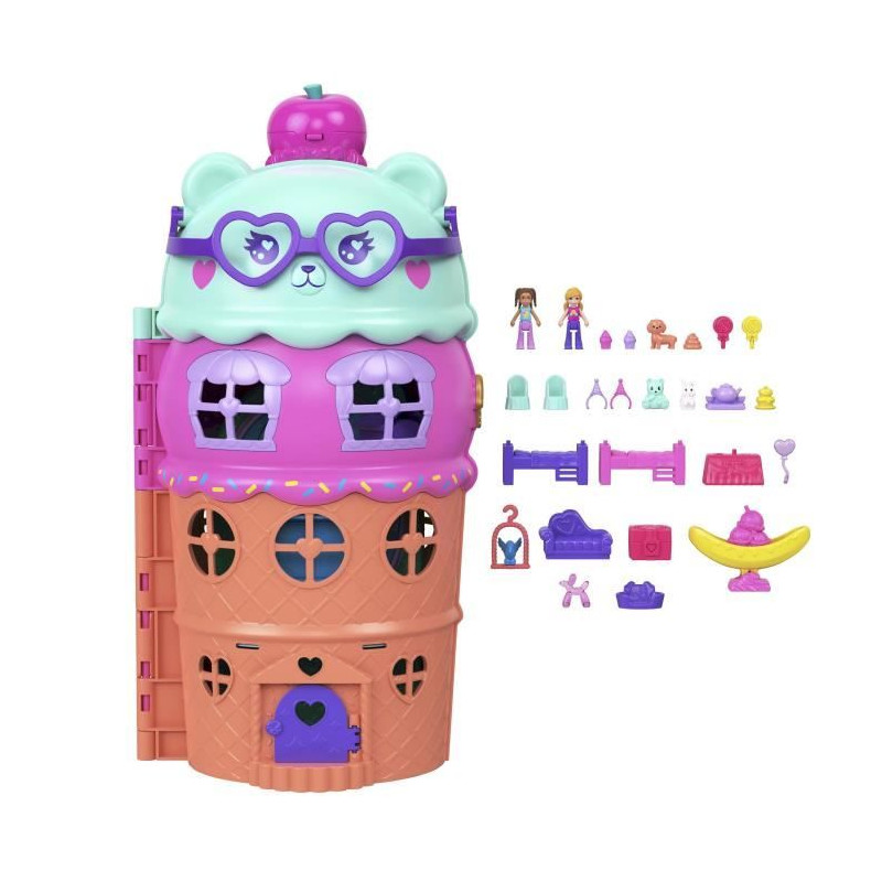 Découvrez le Coffret Maison Cornet de Glace de Polly Pocket, comprenant 2 mini figurines et 23 accessoires. Avec un ascenseur pour relier les 3 niveaux, ce coffret promet des heures de jeu créatif pour les enfants a partir de 4 ans.