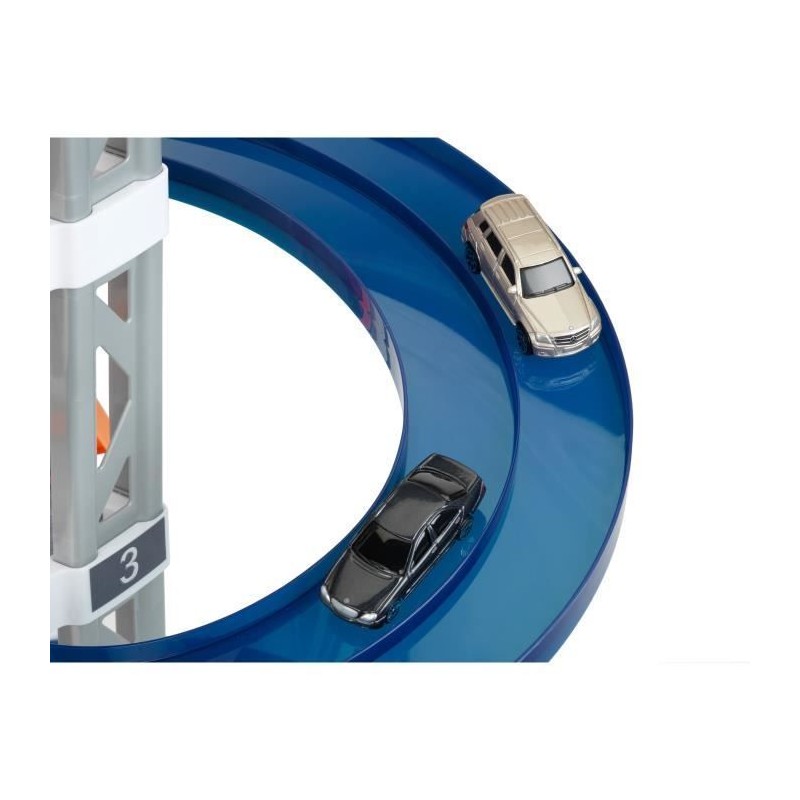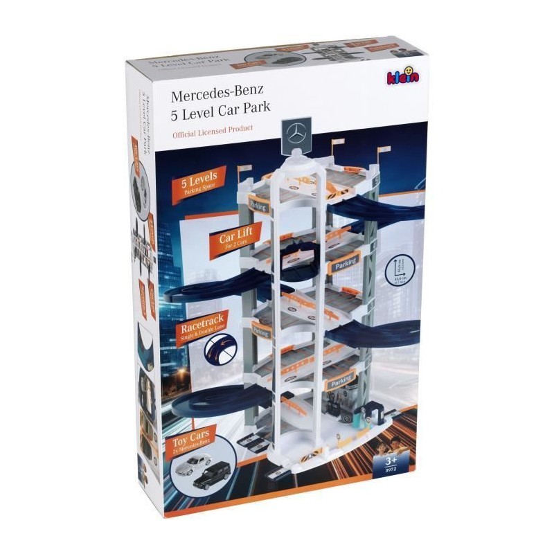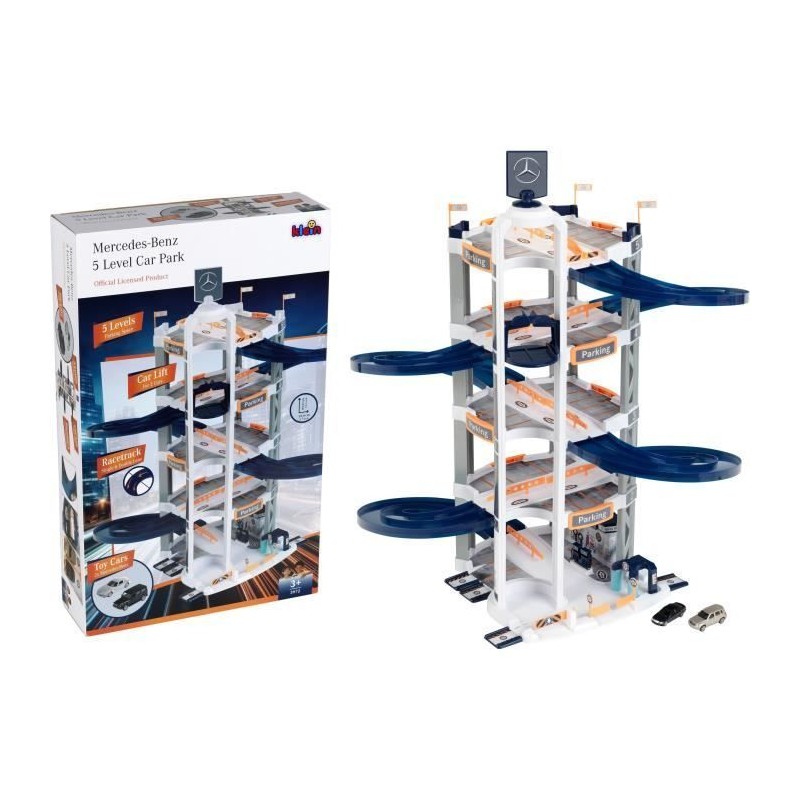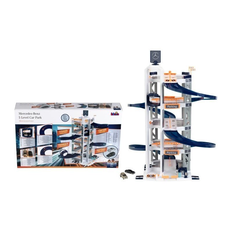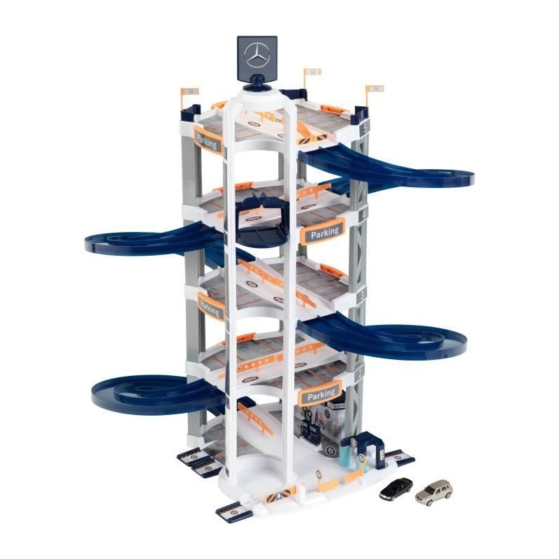 Ce garage a 5 niveaux - stable et tres solide - sous licence Mercedes-Benz est un formidable terrain de jeu pour les amateurs de voitures et de sensations fortes ! Il est équipé de pistes réversibles avec 2 voies d'un côté pour réaliser des courses sensationnelles et 1 voie unique plus large de l'autre, d'un ascenseur manuel pour accéder facilement aux différents niveaux, d'une station de lavage a rouleaux pour des voitures toujours bien propres, d'une station-service pour ne jamais tomber en panne d'essence et de nombreuses places de parking. En clair, de tres nombreuses heures de jeu en perspective ! Plastique de grande qualité, tres résistant.. Livré avec deux petites voitures (échelle 1:24e). Dimensions du garage monté : 55 x 55 x 85 cm. A partir de 3 ans.