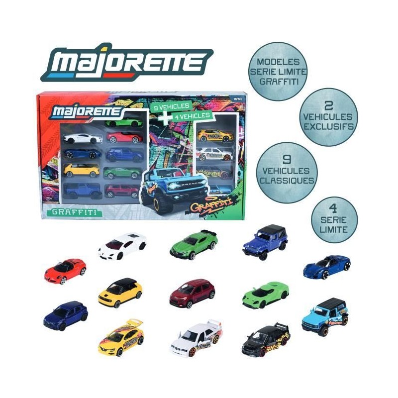 Retrouvez les automobiles les plus célebres au format mini et en métal grâce a Majorette ! Véritables passionnés ou simples amateurs vous trouverez votre bonheur parmi les nombreuses gammes que présente la marque ! Ce grand coffret se compose de 13 véhicules a roues libres : 9 classique et 4 édition limitée sous le theme des graffitis. Vous serez vite séduit par ces véhicules a l'échelle 1/64eme. Certaines disposent de parties ouvrantes, d'amortisseurs et de phares translucides. N'hésitez plus a commencer une nouvelle collection ou a amuser vos enfants avec ces petites voitures ! A partir de 3 ans.