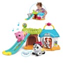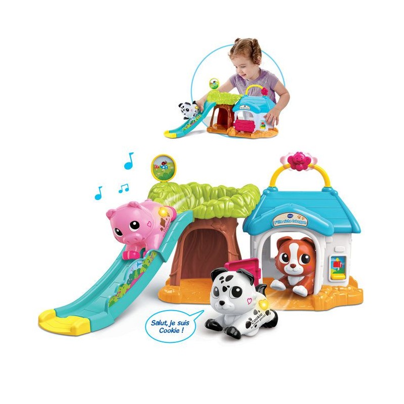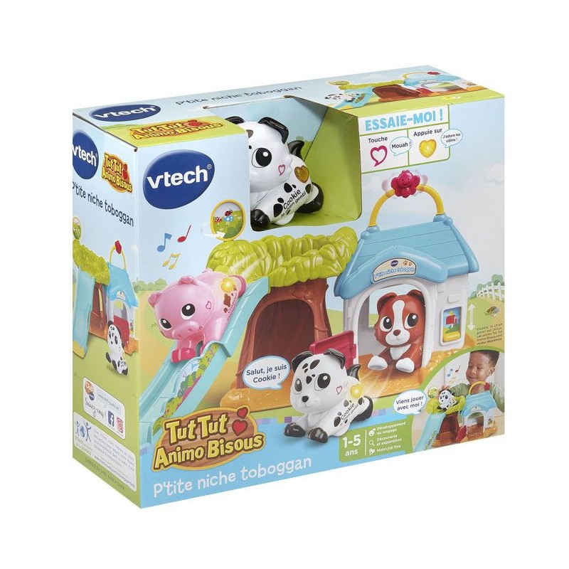 Tut Tut Animo Bisous - Ptite niche toboggan - 1 - 5 ans Une niche colorée avec un toboggan et de nombreuses manipulations ! Une maisonnette amusante et colorée avec un toboggan, un arbre, une cachette, un panneau et un papillon a déplacer. Avec 1 animal électronique, parlant et musical inclus « Cookie, le chien gen
