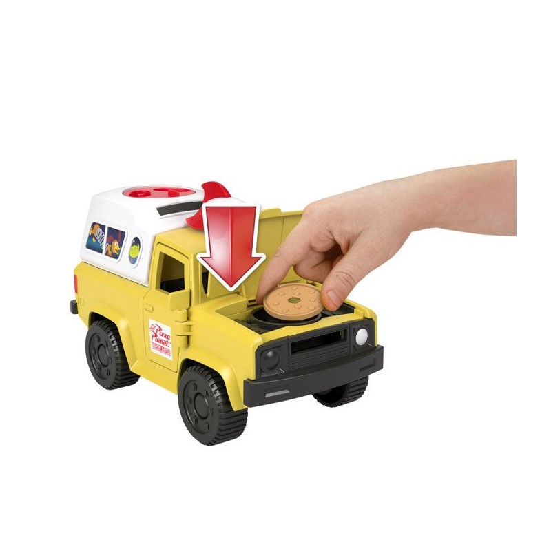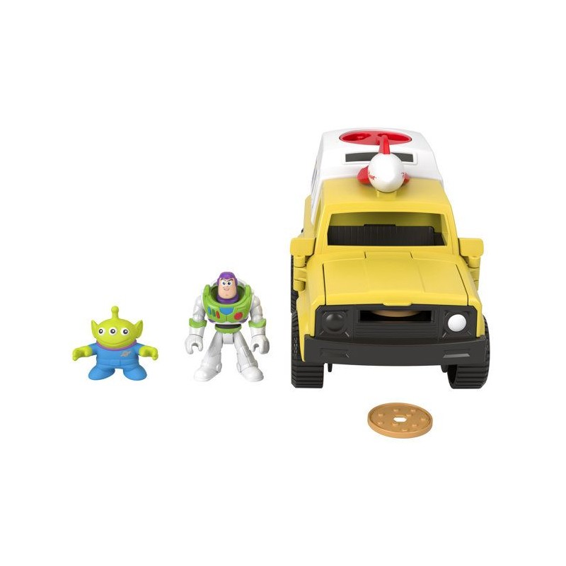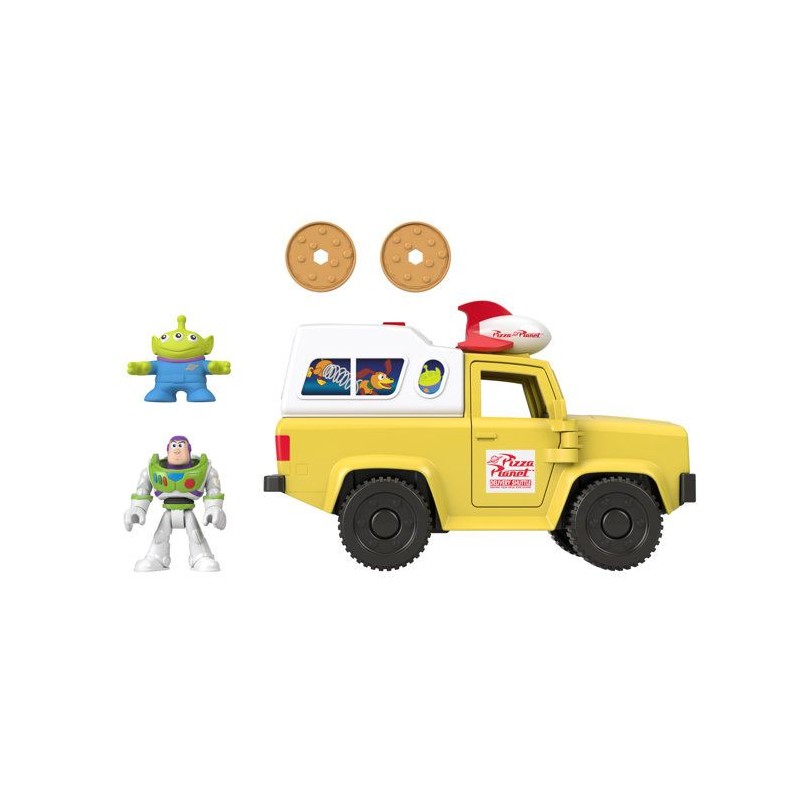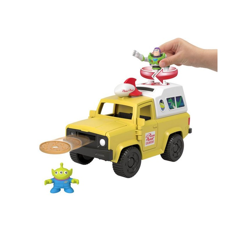 Camion lanceur de disques Pizza Planet avec deux figurines : un alien et Buzz l'éclair. Les disques se rangent sous le capot et se lancent en tournant les figurines sur le dessus du camion.