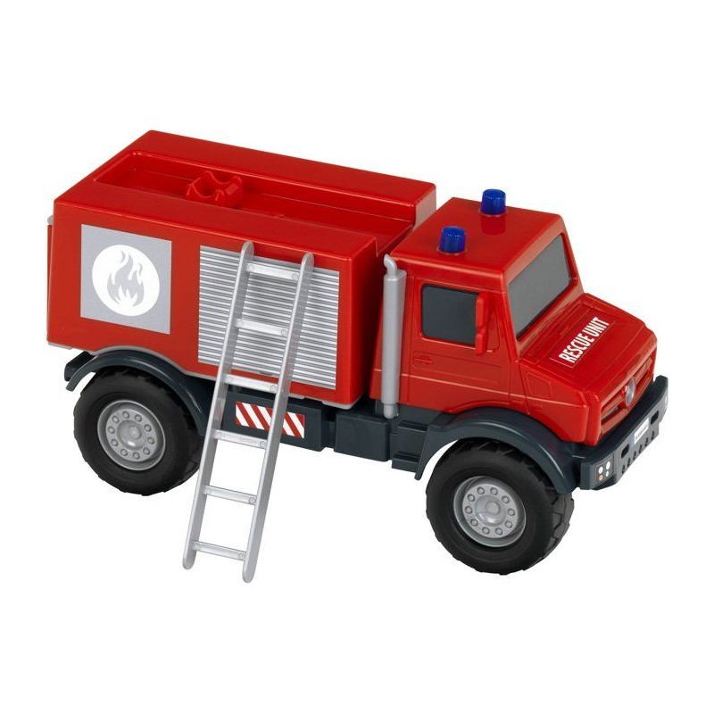 Faites vivre l'imagination des enfants avec ce camion de pompiers tout-terrain sous licence Mercedes-Benz Unimog tres réaliste. Fabriqué en plastique de grande qualité, il est doté de grandes roues souples idéales pour une utilisation en intérieur - sans faire trop de bruit - comme en extérieur (jardin, bac a sable, etc.). Il possede un hayon a l'arriere que les enfants peuvent ouvrir et refermer, parfait pour charger du matériel et le transporter jusque sur les lieux de l'intervention. Enfin, il est équipé d'une échelle qui se trouve sur le toit et qui permettra de mener a bien certaines missions de sauvetage. Stimule l'imagination, la créativité et l'habileté manuelle des enfants. Echelle 1:24. Dimensions hors emballage : 24 x 12 x 13 cm. Fabriqué en Europe. A partir de 3 ans.