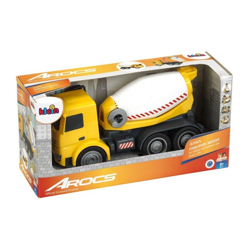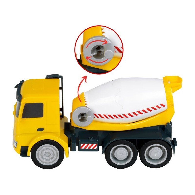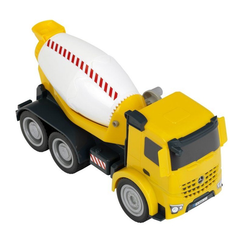 Faites vivre l'imagination des enfants avec ce camion toupie a béton sous licence Mercedes-Benz Arocs tres réaliste. Fabriqué en plastique de grande qualité, il est doté de grandes roues souples idéales pour une utilisation en intérieur - sans faire trop de bruit - comme en extérieur (jardin, bac a sable, etc.). Il possede un réservoir rotatif en forme de toupie inclinée que les enfants peuvent remplir de sable, faire tourner a l'aider de la petite manivelle située sur le côté et basculer pour le vider. Stimule l'imagination, la créativité et l'habileté manuelle. Echelle 1:24. Dimensions hors emballage : 32 x 12 x 16 cm. Fabriqué en Europe. A partir de 3 ans.