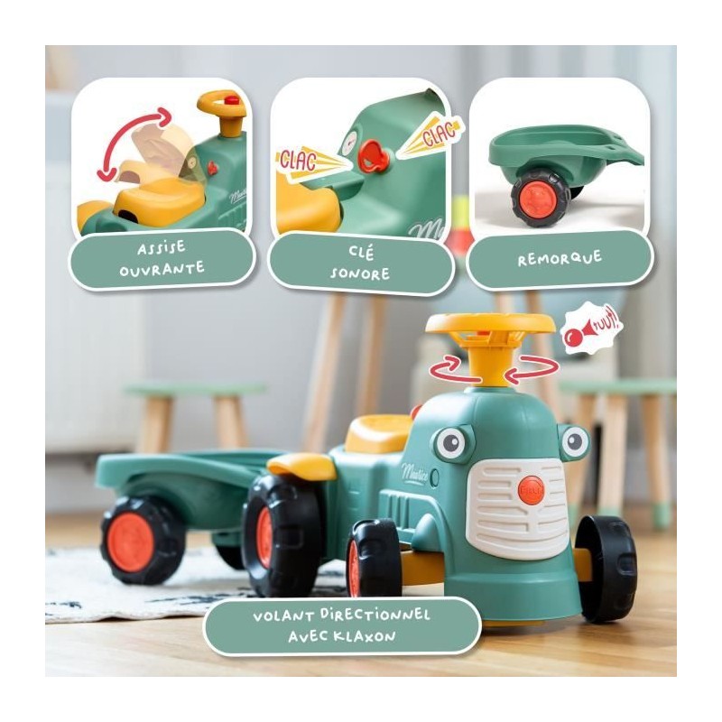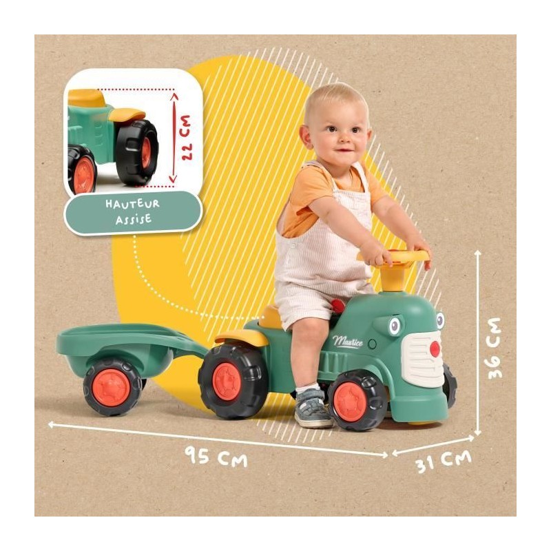 Maurice est un petit tracteur tout mignon et plein d'astuces ! Il accompagne votre enfant des 12 mois. Avec sa remorque, il est le compagnon idéal du jardinage ou du bac a sable. Il est aussi une formidable source d'éveil avec ses jolies couleurs, sa petite clé sonore et son volant directionnel avec klaxon pour développer sa motricité fine et globale. Un petit porteur qui rend hommage a 75 ans de savoir-faire tout en portant un regard vers le futur de nos tous petits. Pour cela Maurice est composé de plastique recyclé a 90% et intégralement fabriqué en France avec autant d'amour que celui que vous portez a vos bout'choux !