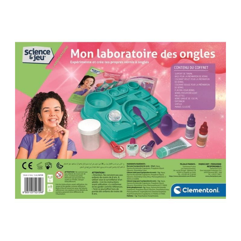 - Un coffret scientifique ludique et créatif qui apprend aux enfants tous les secrets du soin des ongles et du nail art. - La console pratique permet de mélanger la base avec les colorants fournis et de créer de magnifiques vernis a ongles. - Les autocollants et les paillettes sont parfaits pour libérer la créativité. - Tous les accessoires nécessaires a l'expérimentation sont également inclus. - Le manuel contient des notions scientifiques pratiques et intéressantes sur le nail art.